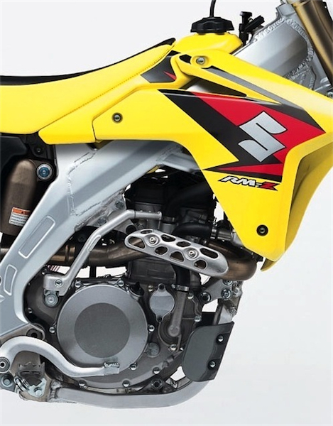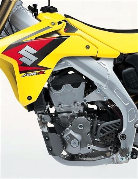 | When designing the new RM-Z mill, Suzuki went with a fairly conventional design pilfered from their GSX-R sport bikes. The top end featured a dual over-head cam, four-valve layout that was adjusted via shim and bucket. The piston was a short skirt, slipper style and the oiling system was an innovative semi-wet sump design. Suzuki innovations included the Suzuki Advanced Sump System (SASS), which positioned the crankshaft lower in the crankcase to reduce the center of gravity, and the Suzuki Active Vent System (SAVS), which reduced crankcase pressure. |