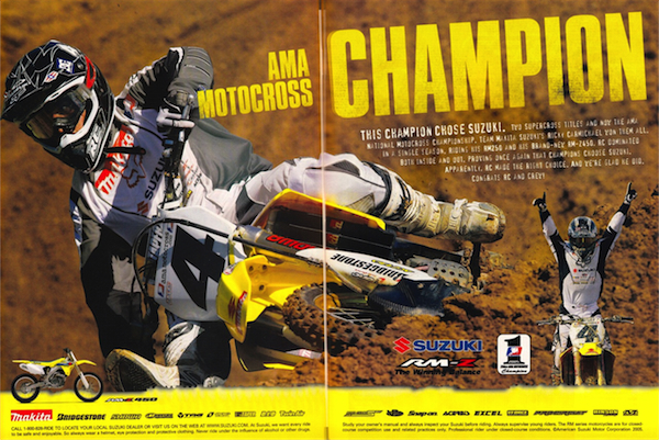 | Wining machine: RC took a major gamble in 2005 signing with Suzuki to ride a bike that was completely unproven. Fortunately, the gamble would pay off for both, with Suzuki’s first 250/450 title since Greg Albertyn did the deed in 1999. |