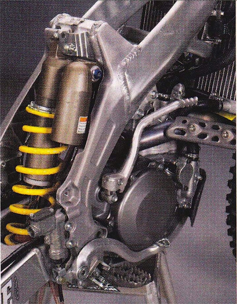 Today, the twin-spar alloy frame is all but ubiquitous on Japanese motocross machines, but in 2004, the jury was still out on the best chassis design. Honda had been the first manufacturer to jump on the twin-spar alloy bandwagon in 1997, and was still the only manufacturer using it in 2004. Yamaha had stuck with steel for their YZF and many people were still questioning the merits of the aluminum design. The alloy chassis’ looked cool, was super strong and could be made lighter in theory, but the rigidity and feel of the aluminum was tricky to get right.