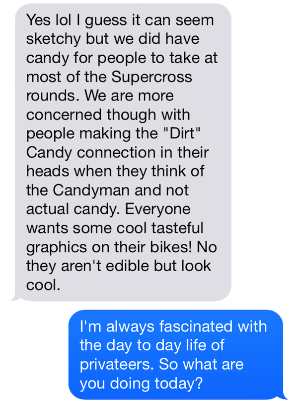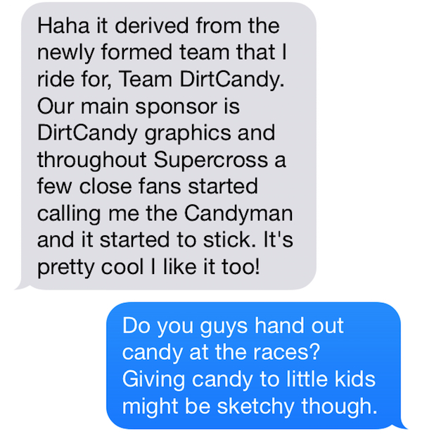 I ranted to anyone that would listen about my frustration with his lack of self-promoting. No doubt sick of my complaining, someone finally got me in touch with Ronnie. After interviewing him last year, I smoked a cigarette and sipped on cheap bourbon, content with my conquest, which you will go read here: http://pulpmx.com/stories/27-minutes-46-seconds-ronnie-stewart. Although he’s a privateer, in every sense of the word the Candyman has carried his momentum outdoors with consistent finishes. I got in touch with him to catch up about his newfound popularity and success.