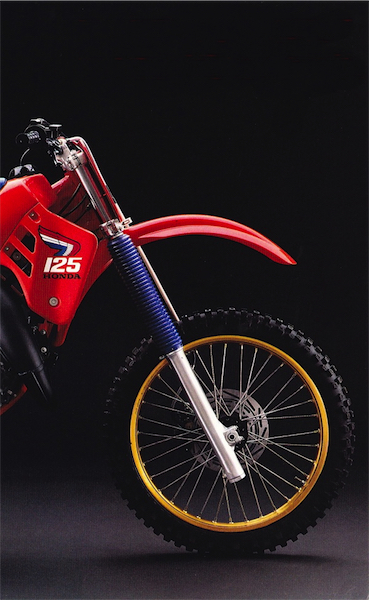 While the motor was most certainly the star of the new ’87 CR, it was far from the bikes only virtue. For 1987, Honda had seen fit to finally equip their eighth-liter rocket with the latest in suspension components. Previously, the Honda 125’s had been a year or two behind the equipment offered on the 250 and 500. For ’87, that gap disappeared with an upgrade to Showa’s latest 43mm cartridge forks. These high-tech beauties had taken the sport by storm in 1986 and laid waste to the damper-rod competition. For 1987, only Honda and Suzuki (equipped with Kayaba’s new cartridge sliders) would receive the benefit of these works-caliber suspension components.