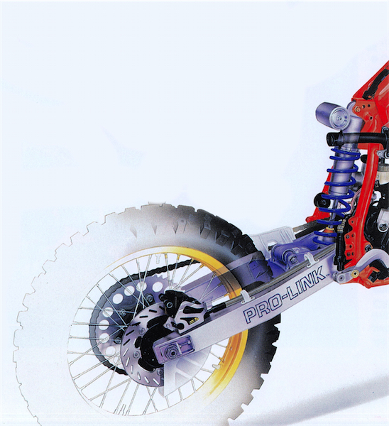 Hunchback: For 1987, Honda spec’d an all-new shock design for all the full-sice CR’s. This new “piggyback” design moved the shock reservoir from a tethered location on the frame to the top of the shock body itself. While this new design was lighter and more compact, the new location brought with it problems of its own. Because the reservoir was now buried deep inside the bodywork, it received very little cooling air and suffered from premature fade (the same problem that had troubled early Yamaha monoshocks). This design would only last one year on the 250 and be fazed out on the 125 and 500 by 1989. |