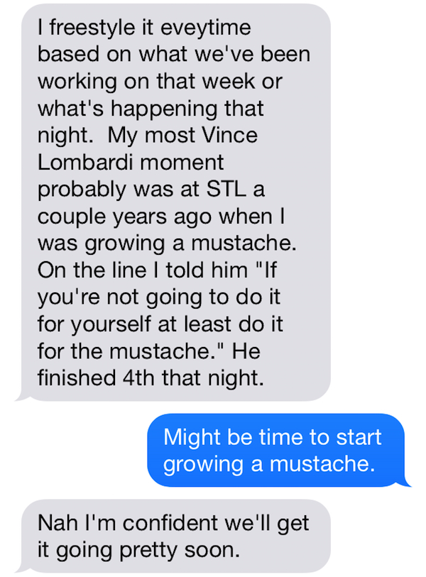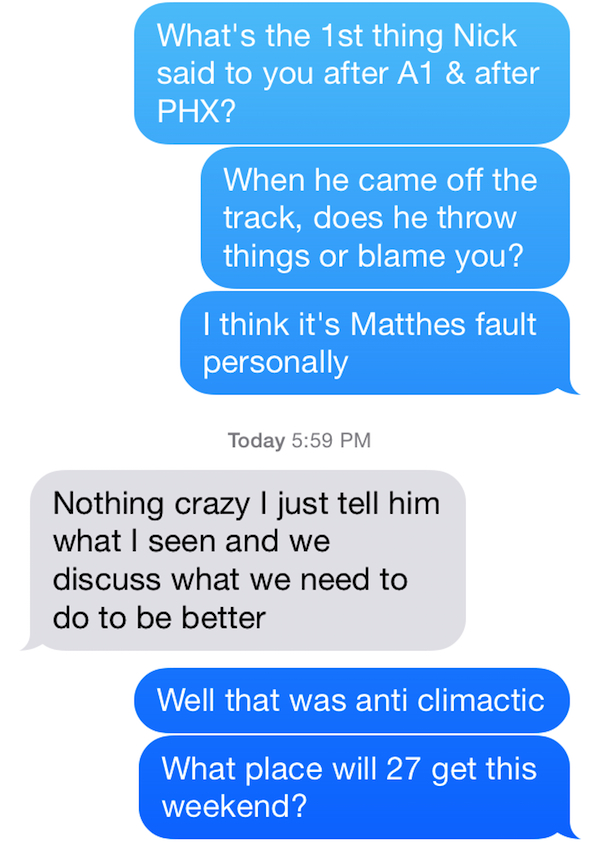 Well, Nick Wey came up Just Short again (insert cringe face emoji). He looked good on the track walk, even complimented me for wearing more clothing than usual. Matthes assured me there was no way that Wey would get back to me, so if you can’t get ahold of a rider, you get the next best thin…his mechanic.