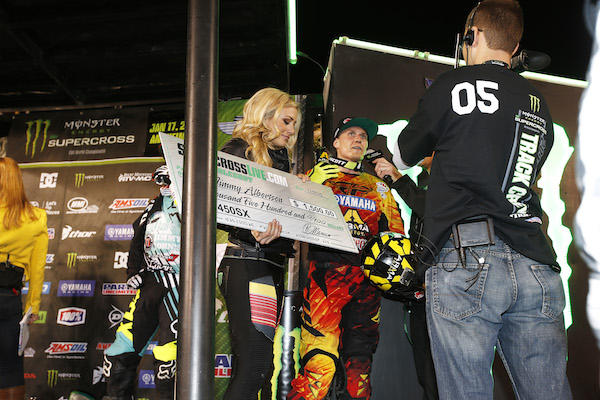 In the 450 Main event, the holeshot line credited Jimmy Albertson with the holeshot, which you would not have known if you were not paying attention since he promptly jumped off the track in the first rhythm section and Ralph and Jeff made no mention of it.