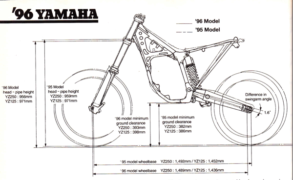 An all-new frame for offered more rigidity, reduced trail, greater ground clearance and a shorter wheelbase for 1996. |