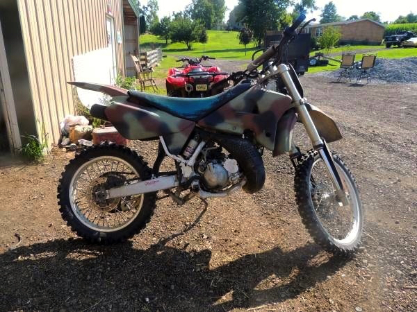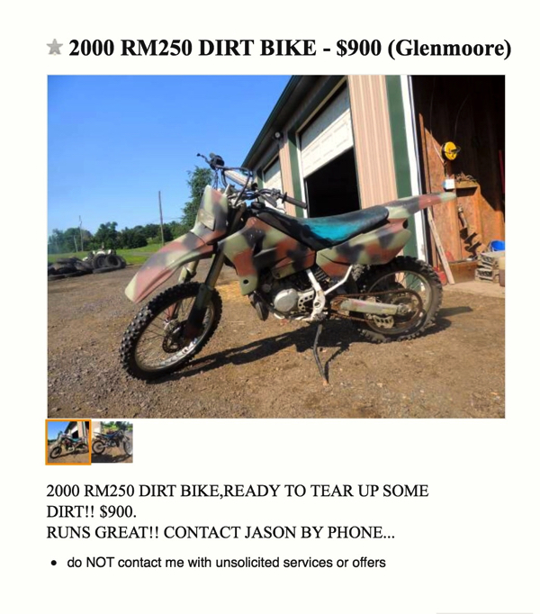 Maybe it was the camo that threw our intrepid Craigs-lister off? After all, it can be hard to discern a bike’s true nature through all that badass. The competition would never see you coming (except for the seat, where the Desert Storm treatment has given up the ghost), and that whisper-quiet WR muffler would certainly not give you away. Viewed in that light, the $900 looks like a pretty screaming deal and of course it is “READY TO TEAR UP SOME DIRT”! |