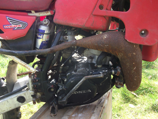 Wow, just…wow. I’m really not sure where to start with this poor little 125. The bike appears to be cobbled together conglomeration of parts from a Honda CR125R and Honda MTX125 dual sport. One would assume the powerful CR125R motor was repurposed for a three-wheeler or some such death trap and the resulting rolling chassis looked like a perfect home for the mild-mannered MTX’s street bike engine. The stock MTX came with a left side pipe, and this does not appear to be the stock CR unit either. It actually appears so be similar to the one-off works pipe Mike Kiedrowski ran on his Factory CR125R in ’89 (Ron Wood actually trimmed the bottom of the stock shroud so it would clear), so maybe they scored that for this beauty. |