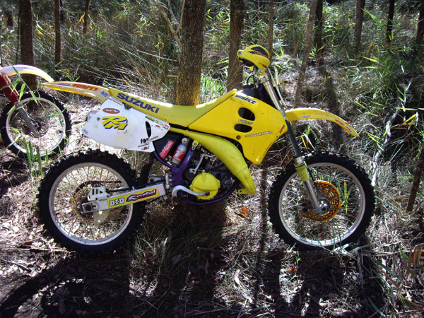 First to go was the serious gunmetal color of the frame, to be replaced with a classy shade of purple to match the Suzuki logo on the seat. Next was an upgrade to glow-in-the-dark yellow for the pipe and clutch cover, just in case either needs servicing on a night ride. Last, was the addition of some sweet seal savers for the forks and some major league bark busters to protect the digits when the bar banging gets out of control. Overall, it is a classy interpretation of mid-nineties moto chic.