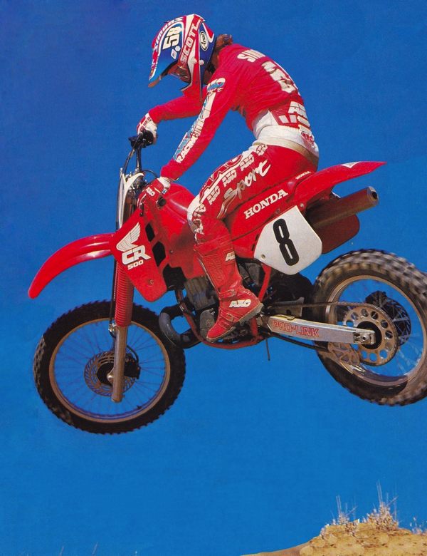 For 1988, The CR500R remained the same big, burly and beastly machine it had been in 1987. The new dark red color pallet updated the looks, but the motor remained unchanged, aside from a slight increase in crank inertia. In spite of this small attempt smooth out the powerband, the CR remained the most violent of the ’88 Open classers. Power was incredibly explosive off idle and ripped into an eye watering midrange blast. It was the type of power that shredded tires, relocated shoulder sockets and sent posers back to the 250 class. Dirt Rider Magazine photo |