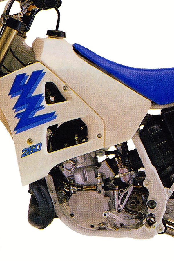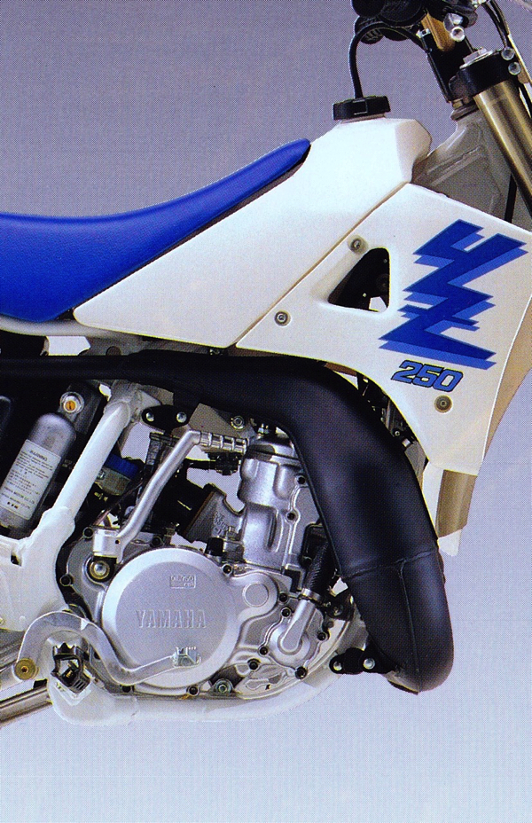 In direct contrast to the Suzuki approach, Yamaha had done very little to convert their YZ250 to off-road use. The new YZ250WR made no concessions to the EPA and was sold as a closed course only machine. There were no lights (although it was wired to power them), no choked off silencer (or spark arrestor) and no soft springs in the suspension. It was pure motocrosser, with only wider gear ratios, a heavier flywheel and blue accenting to set it apart from the regular YZ. While this meant far more power than the RMX (or any other off-road 250), it also meant far less flexibility in the nasty stuff.