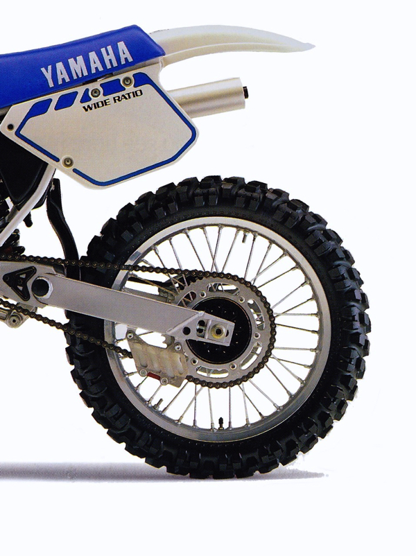 Probably the most peculiar choice on the new YZ-WR was Yamaha’s decision to mount their new 19” rear wheel on the blue bullet. The 19” offered lighter weight, less sidewall flex and better feel in certain conditions, but paid for it with much poorer resistance to flats. This was a worthy trade off on a motocross track, but made absolutely no sense on a machine made to be ridden in the middle of nowhere. Fortunately, the controversial 19” would only last one year and be replaced with a more off-road friendly 18” rear hoop in 1990. |