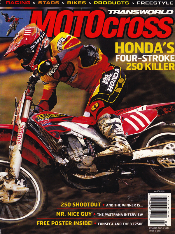 After the debut in Japan, a returning from abroad Ryan Hughes was picked to pilot Honda’s newest baby in the 2001 Motocross Nationals. Using the same one-year works bike exemption Yamaha employed in 1997, Honda was able to race a pre-production CRF450R throughout the summer. Both Hughes and Mike LaRocco would spend time shaking the new machine down prior to its 2002 production debut. Photo Credit: Donn Maeda/ Transworld MX |