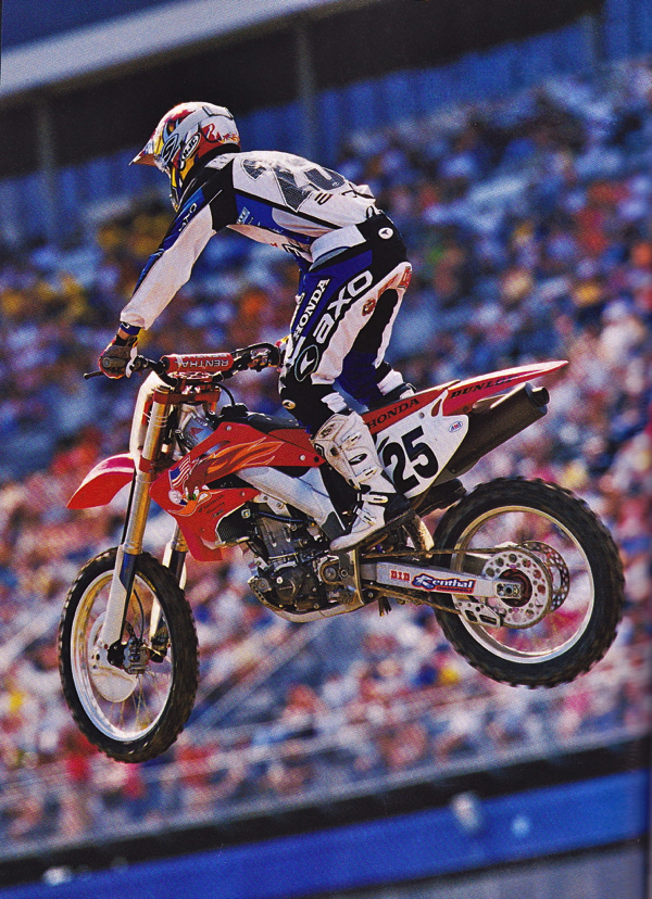 Fresh off taking Yamaha’s new YZ250F to second in the 2001 125 East Supercross standings, Nathan Ramsey was tapped to pilot the production version of the CRF450R in Supercross and Motocross for 2002. While Nathan would finish the Supercross series in sixth, he would give the new bike its first AMA victory with a surprising win at Pontiac in April. Photo Credit: Simon Cudby/RacerX |