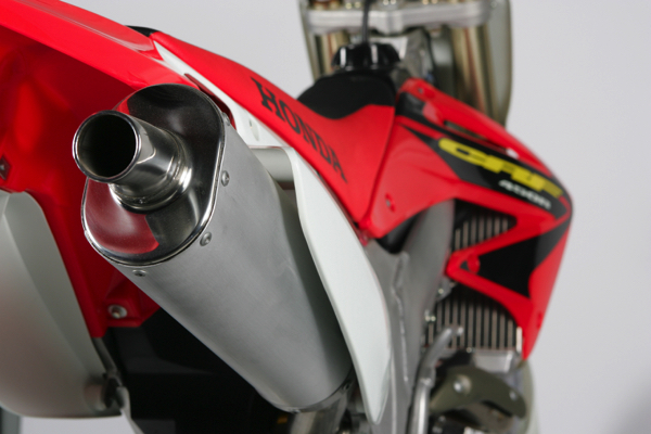 North American bound CRF’s got this big aluminum silencer with a large turned down stinger tip, while those tagged for Europe received an enclosed tip mandated by the FIM. Unfortunately, neither version proved particularly quiet and the new CRF turned out to be just as auditorily offensive as the booming YZF. |