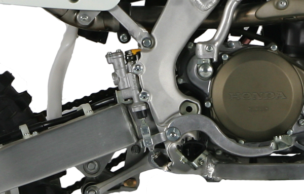 In another effort to save weight, Honda integrated the CRF’s rear brake reservoir and master cylinder into a combined unit. While certainly light and compact, some rider had problems with boiling its meager fluid capacity. |