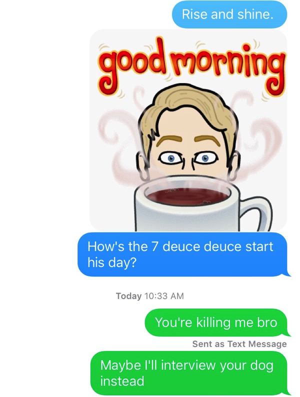 Being on the sidelines, you would think The 7DeuceDeuce has all the time in the world to text me back… but somehow I’m forced to blow him up for a response (insert angry faced emoji).
