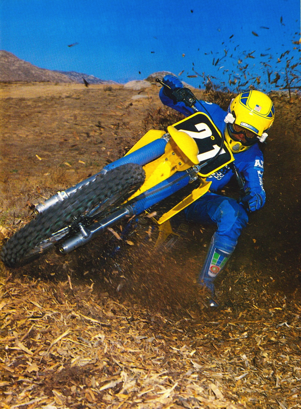 Pin it and pray: With its narrow powerband, lack of torque and cranky clutch, keeping the little zook at full boil was no easy task. Gearing it down two teeth, bolting on a Pro Circuit pipe and learning to never shut off were a Suzuki rider’s only hope in 1986. Photo credit: Motocross Action |
