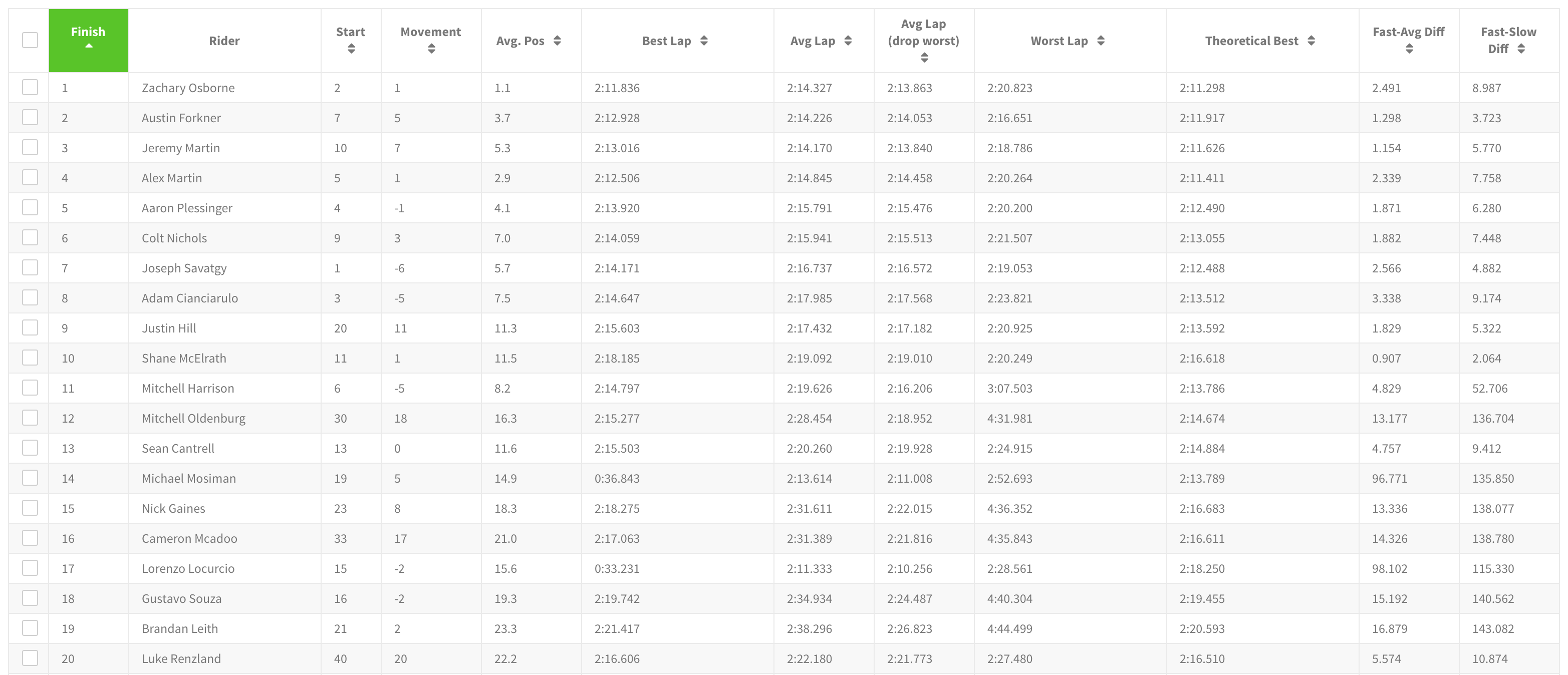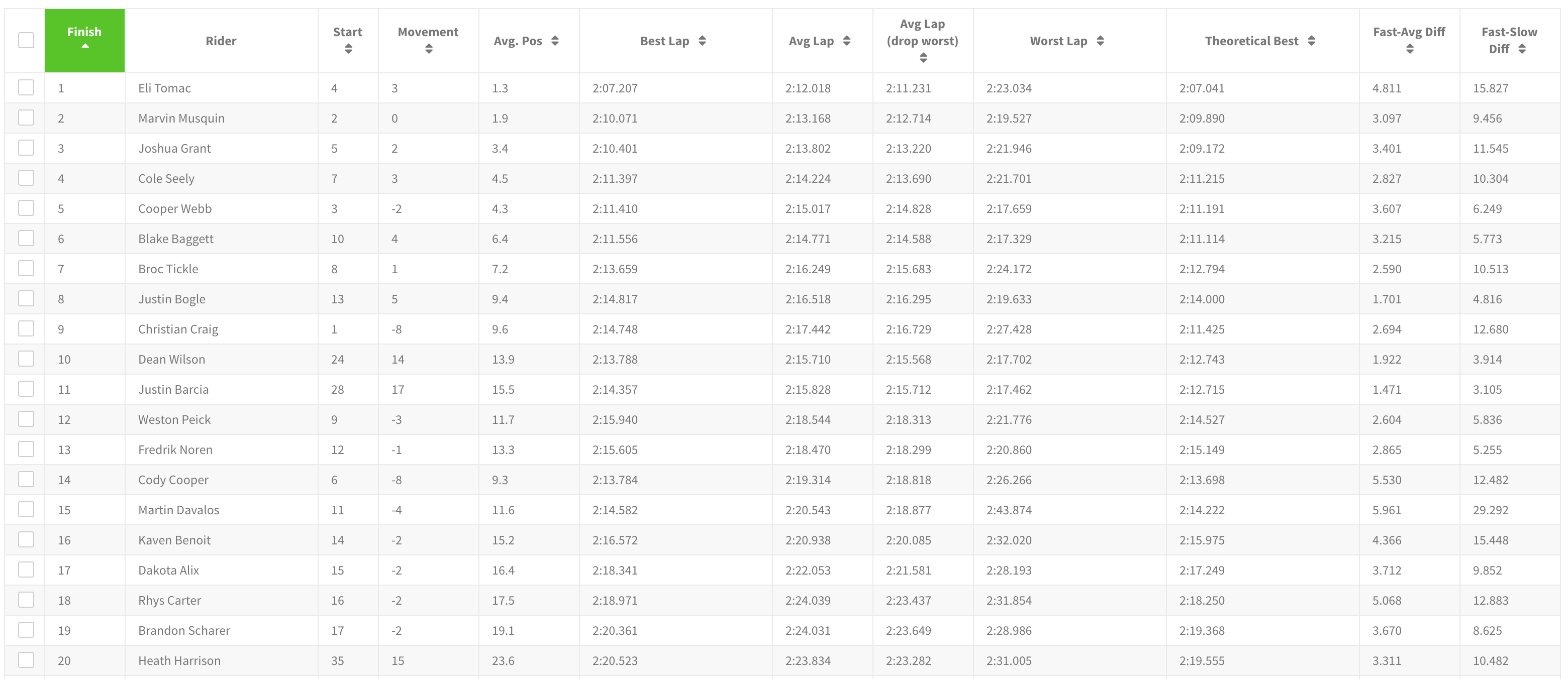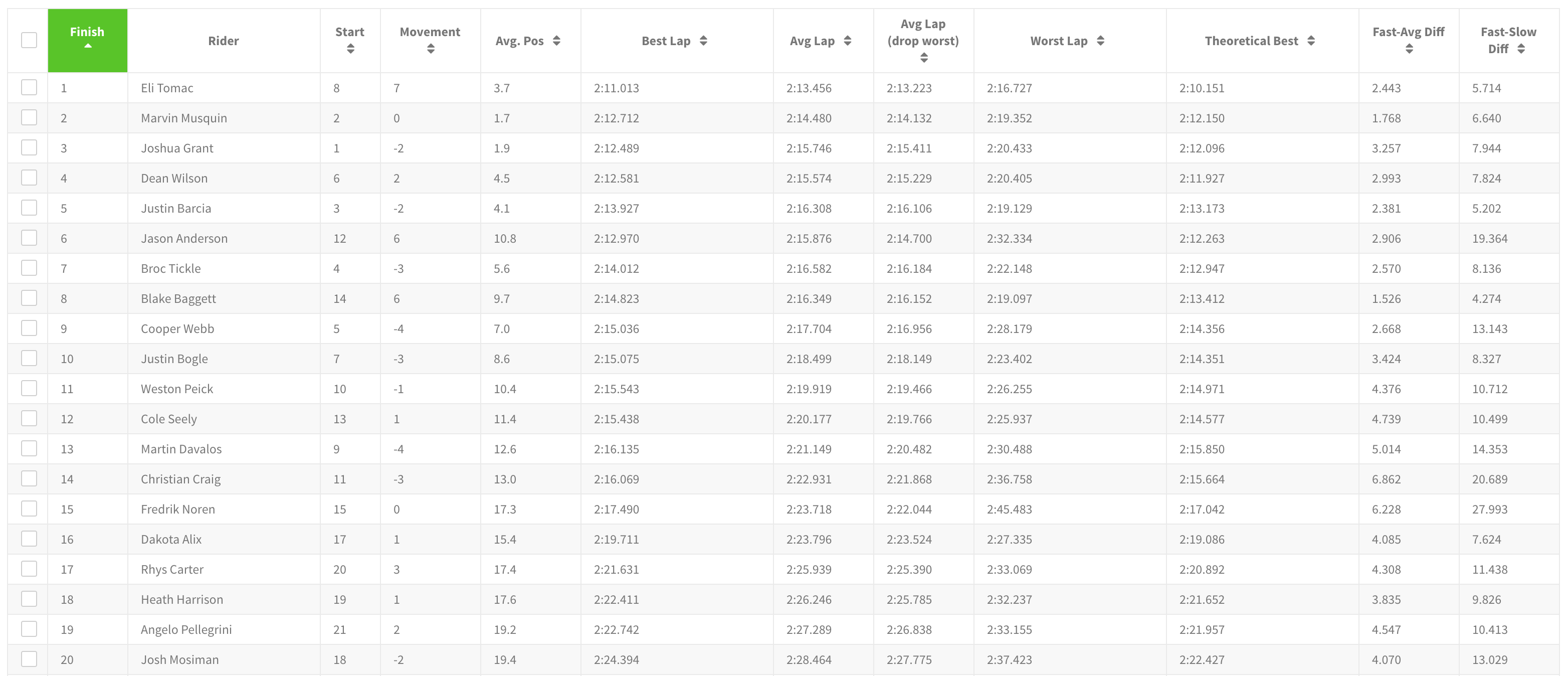 Eli Tomac and Marvin Musquin’s average logged positions throughout the entirety of the race. Eli’s average stood out to me since he did in fact end up winning. It basically means he was somewhat slow to move through the pack and didn’t get into the lead until late in the race. I got interested about other race winners who might have a high average position, and none other than Ricky Carmichael in 450 Moto 1 of 2006 tallied an average of 5.6. This was moslty due to how far back he started, so a standard deviation may be a better stat to look for, but fun stuff regardless.