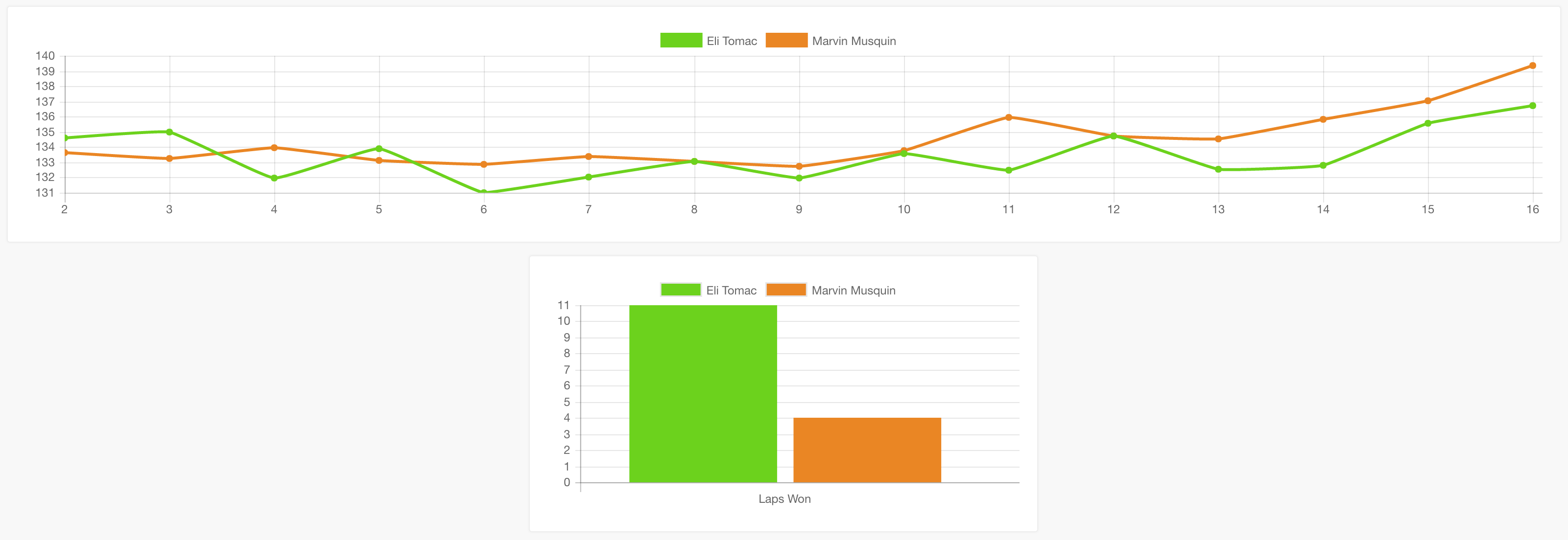 In a head to head lap comparison, Jeremy Martin had a faster lap than Zach Osborne for 8 of the 15 counted laps.