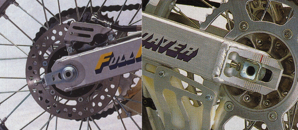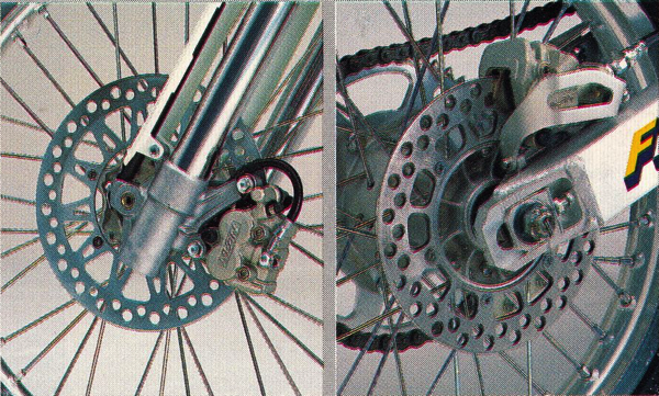 Much like the motor and chassis, the new suspension proved to be a mixed bag. The new 41mm inverted forks offered 12.2 inches of travel and 20 adjustable settings for compression and rebound damping. In terms of performance, they were far better than the abysmal 45mm Showa inverted forks offered on the 1989 CR250R, but not as plush as the excellent 46mm KYB conventional units found on the KX250. Once broken in, they offered good compliance and excellent control. The rigidity of the inverted design provided more feedback than the conventional units found on the KX, but fast guys appreciated the reduced flex and lowered propensity to get caught in deep ruts.
