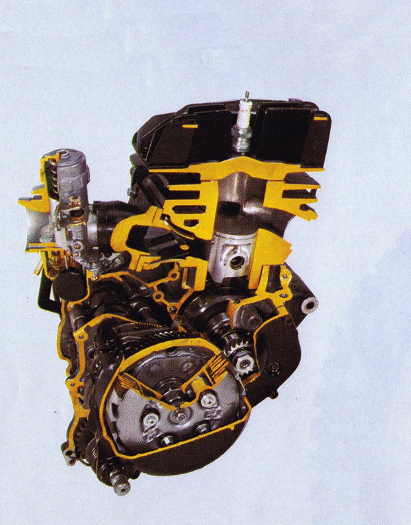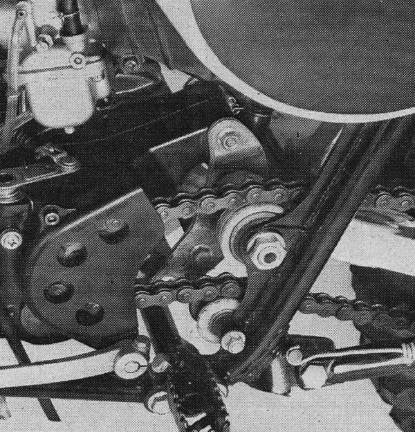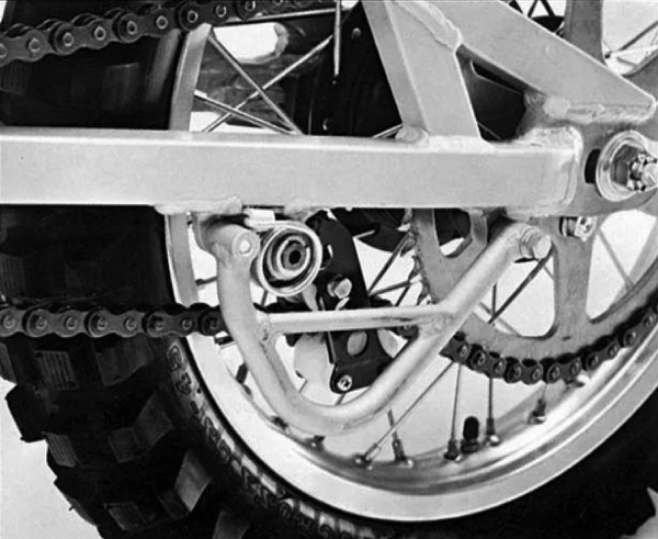 One of the major problems facing early long-travel suspension designs was how to keep the chain from derailing as the suspension moved through its arc. Engineers had yet to work out the importance of having the countershaft directly adjacent to the swingarm pivot and instead relied on a complex combination of rollers and tensioners to keep the chain from going slack. Photo Credit: Yamaha |
