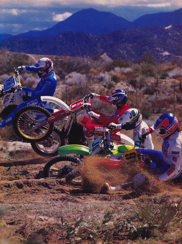 For 1990, the YZ490 walked into its final season with only a set of stripes on the seat and a set of red bars to differentiate it from its 1989 predecessor. The dreamed of liquid-cooled YZM replica über-500 never materialized and Yamaha loyalists were left to soldier on for one last season with the air-cooled and drum-braked YZ490. It still detonated on top, blubbered off the bottom and vibrated like something had to be wrong, but proved nearly indestructible as long as you ran a 50/50 mix of race gas to keep the pinging under control.