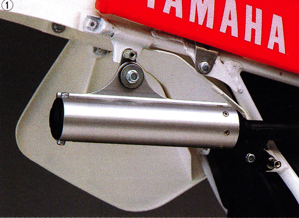 | Although aluminum and repackable, the stock silencer on the YZ490 was not particularly effective at quieting the big 490. When you added in the ringing of the YZ’s cooling fins, you had by far the loudest 500 on the track. Photo Credit: Yamaha |