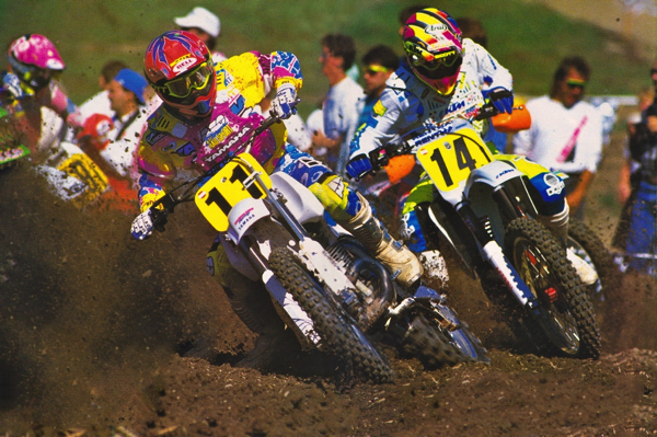 | In 1991, Yamaha gave the YZ490 one last hurrah by reintroducing it as the WR500. Basically a 1991 YZ250 chassis with an air-cooled YZ490 motor shoehorned in, the WR was good enough to take Damon Bradshaw (number 11 above leading KTM’s Mike Fisher) to victory in the first moto at Broome-Tioga in 1991. Photo Credit: Motocross Action |