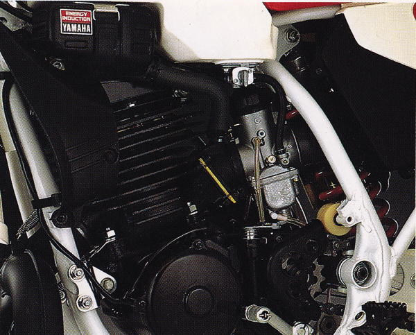 | Energy Induction: Remember the Boost Bottle? Chances are, if you are not racing in the 40+ class, you probably don’t. All the rage in the late seventies, the Boost Bottle consisted of a small hollow canister that was connected to the intake manifold via a rubber hose. The theory behind this gizmo was to provide the motor with a small air reserve that would smooth out fluctuations in intake pressure, and in turn, improve throttle response and low-end torque. In 1981, Yamaha became the first manufacturer to actually stick one on a production bike, renaming it “Energy Induction” and bolting it on the YZ250. Quickly forgotten by the rest of the motocross world, the Boost Bottle would live on in Yamaha’s lineup on the YZ490 until the model’s demise in 1990. Photo Credit: Yamaha |