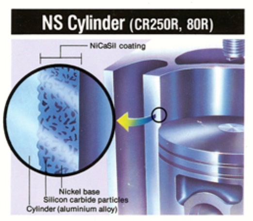 One of the secrets to the Honda’s new CR80R power plant was a switch to NiCaSil (Nickel Carbide Silicon) for the cylinder’s liner. Thinner, harder and slipperier than a steel liner, NiCaSil allowed engineers to run tighter tolerances inside the motor without fear of seizure. Photo Credit: Honda