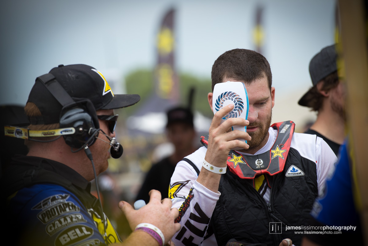 It was hot and humid at the Dunes and riders were trying everything they could to stay cool before the moto, as Matt Georke’s ice vest and fan demonstrate.