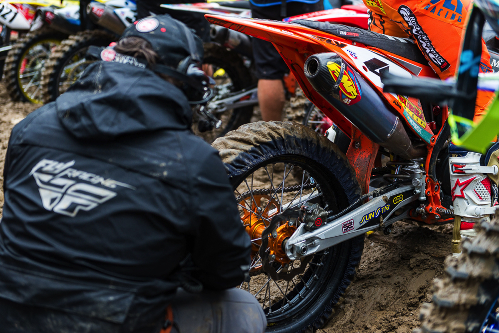 Traction on a muddy start is everything. Making sure there is no mud packed into the tire knobbies can be the difference between a holeshot and 20th.