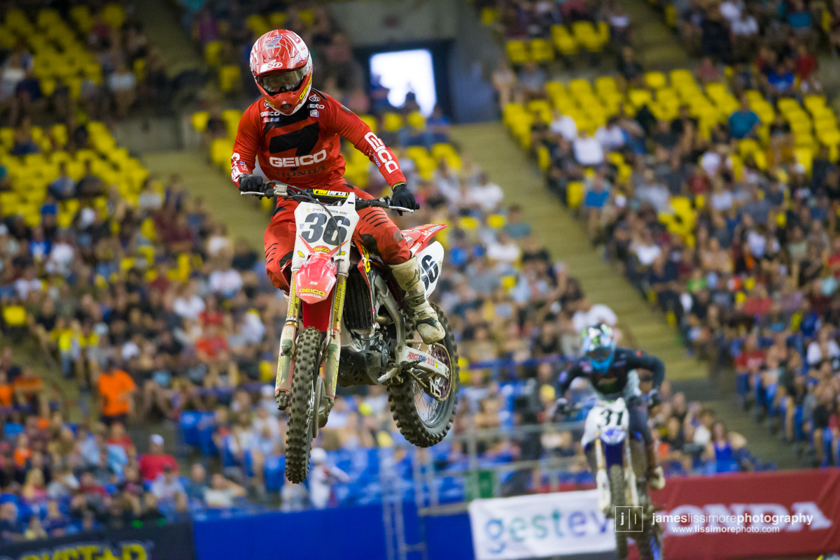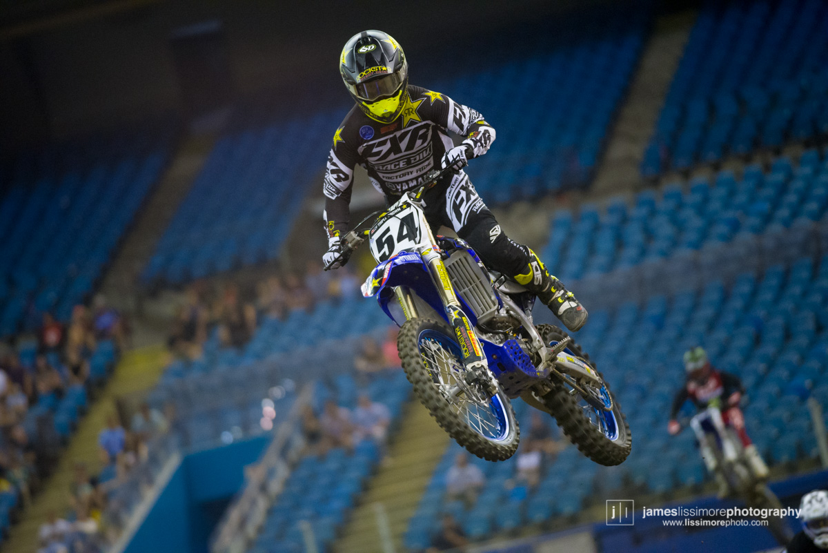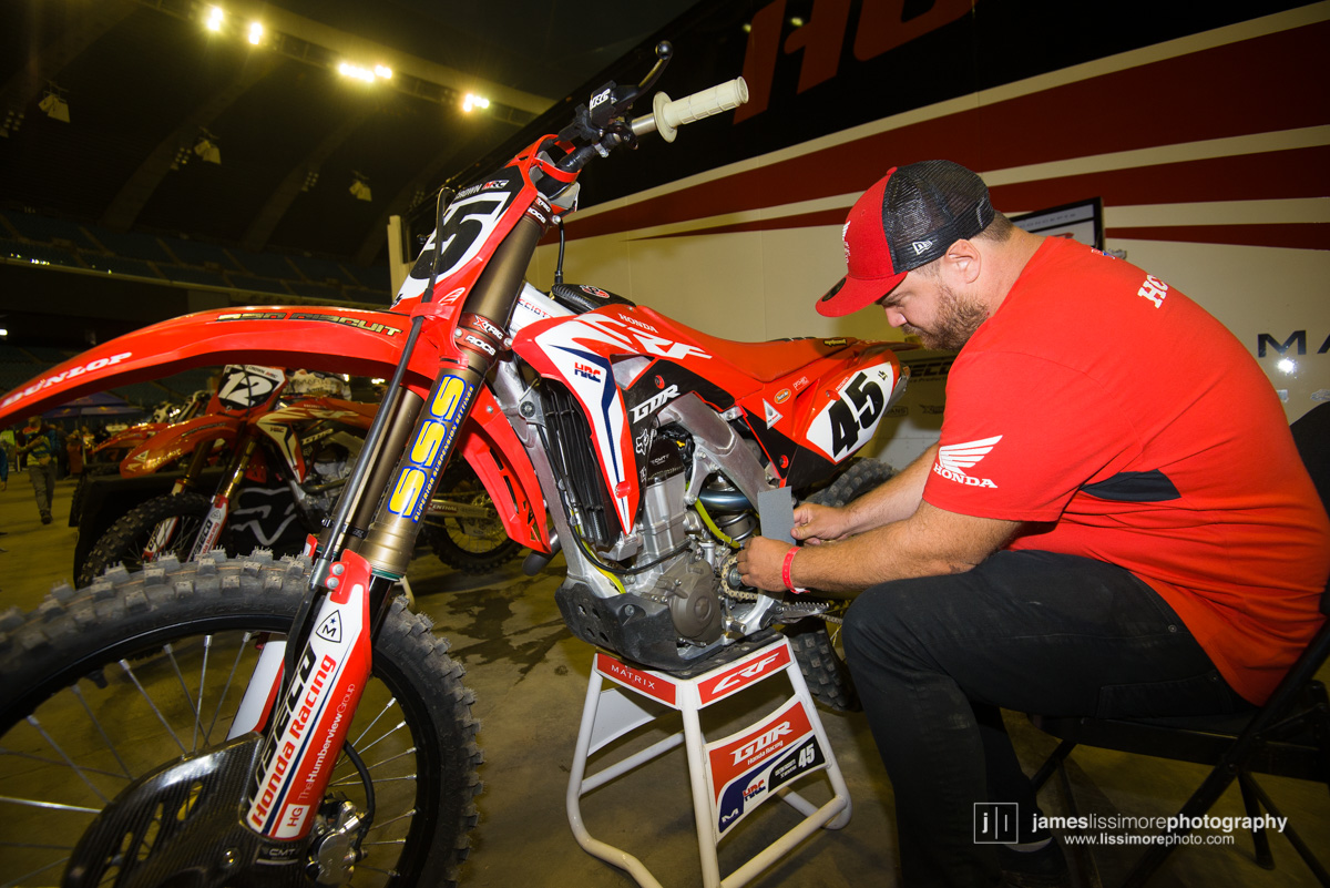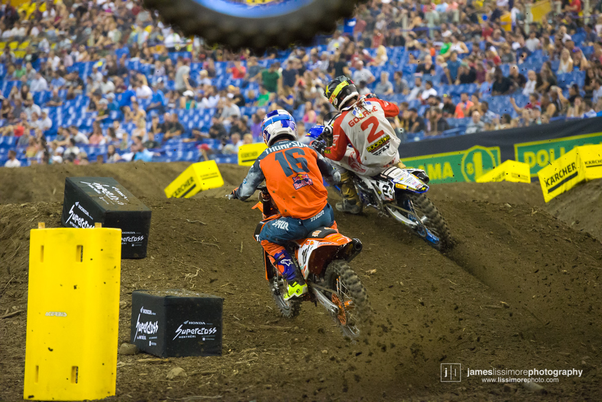Olympic Stadium in Montreal was the site of the race and although it looks pretty cool, it’s best by date has come and gone for sure.Lissimore actually makes the inside of the stadium seem cool here.Eric Peronnard was the man who got all the American riders there and made sure everything ent smooth behind the scenes.GDR Honda team owner Diggs puts on some grip tape on Facciotti’s bike and he also wrenched for Dylan Wright. Then he bought pizza for the everyone after the main. Yay DiggsLots of controversy about Alex Martin racing his 250 in both classes. The team had white on black #26’s for Martin but then he was booted to 450 class and needed numbers. So GDR Honda had some backgrounds on the truck from when Jake Nichols raced for the team. Bingo, bango- Martin became #145Hot Dog Vendor laughs and laughs about trying to replace Pettis in 2019.Speaking of Pettis, he easily won the MX2 main event. What a year for for Jess.Canada MX has stepped up this year with the addition of the stand behind the starting lineHanny was there on his new Honda marketing ride. But his MX suspensionheld him back out there.Goerke led most of the second main event until Mookie caught him from a ways back. For about a lap it was a great race between them.Peronnard brought in a couple of French SX vets in Cedric Soubeyras and Thomas Ramette. And they were on Suzuki’s at that. Combined with Martin, they tripled the amount of Suzuki’s that raced in all of Canadian moto this year.Alex “Nichols” Martin was pretty good on the smaller bike out there. He’s very stoked on his 2019 machine although he rode the 2018 in Montreal.Facciotti didn’t have the night he wanted to under the lights and lost a few points to Thompson in the 100K Rockstar Triple Crown chase.Ramette, the true Rammer out there.Filthy Phil debuted his Rockstar OTSFF Yamaha ride and new FXR gear. He crashed in the final main event and then got run over by Hampshire.T-Dags got a great start in the final main event and led a lap and everything.RJ Hampshire was there, had some bike issues, ate poop because of them and then got put down by Hanny in main number 1. Rough night for the #36.Colt Nichols was very good all day long, just a tick off Mookie.These two had some great races in almost every main event with Goerke getting the edge for third.Mike Brown was there! And although he’s 43 years old and wasn’t that comfortable on the full-on SX track he did ok.Mookie was the man in Montreal going 1-1-1.This man wanted to light me on fire just a few years ago. We’re good now though!