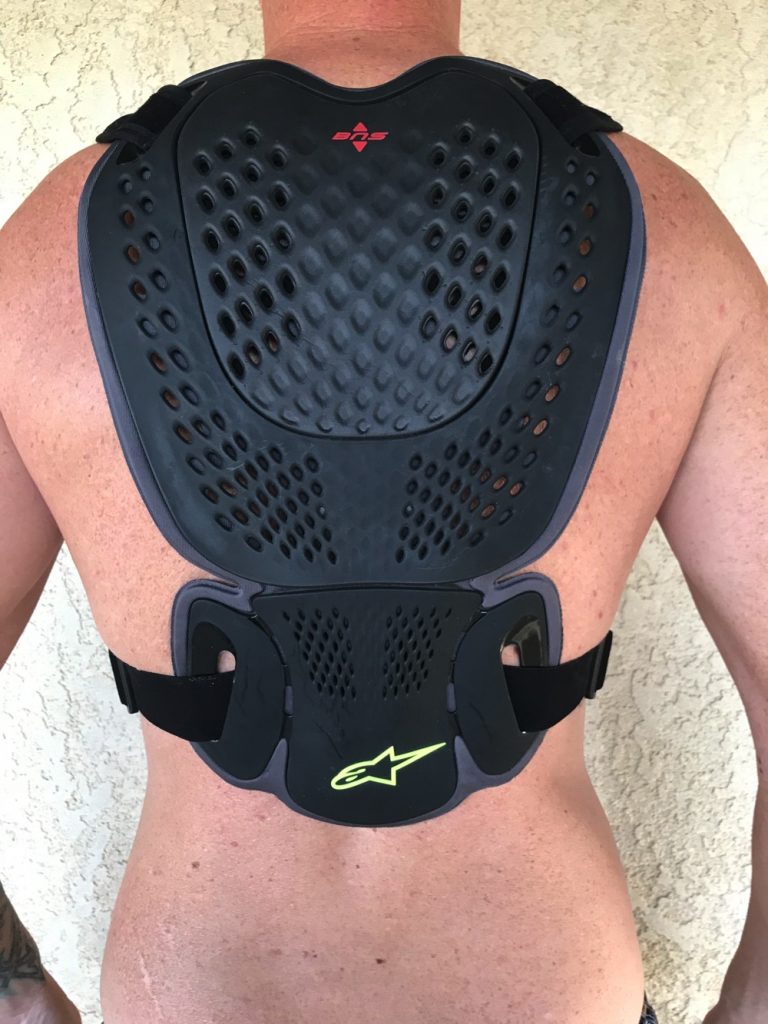 I am always looking for maximum flexibility when I ride, which means that I don’t always dress for the crash, but instead I dress for the ride. I tell my son Aden “do as I say not as I do”. I have been actually listing to my own advice lately and have ben wearing some sort of protection under my jersey. I am also very picky about what goes over or underneath my jersey before I get out onto the track. Alpinestars has its A-1 Roost Guard, so I decided to try it for a while to see if I can live with having some protection under my jersey. Don’t get confused, as this is not your full-on, maximum protection chest protector. The A-1 Roost Guard is constructed of a poly material blend, and the front guard is CE certified against impacts and roost (the back shell is not). However, the back shell is removable, and the whole shell is completely perforated to allow airflow through to your body. The shoulder pads are removable, and the A-1 comes in combined sizes M/L and XL/XXL.