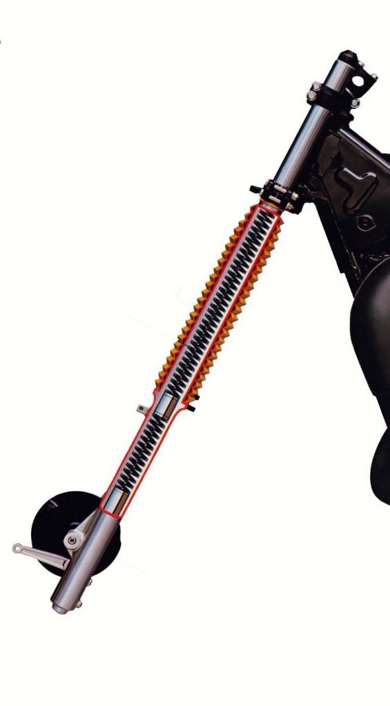 New air-assisted 38mm Kayaba spring forks boosted travel over an inch for 1980. Photo Credit: Yamaha