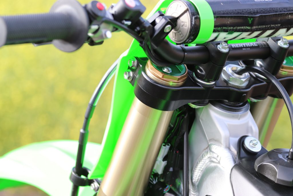 Rider Triangle: The seat to peg to handlebar ratio is ok for my 6’0 frame, but Kawasaki needs to get a new handlebar bend. The 971 Renthal bend is too tall/wide feeling and needs to be updated. I don’t mind the 7/8 size, but when I sit down on the seat, coming into corners, it feels like my arms are way too high. This puts my body positioning in the wrong place coming into corners and makes the bike want to stand upright mid corner. Kawasaki could remedy this situation by running a 983 7/8 Renthal handlebar, which is much more neutral feeling for the rider on this bike.