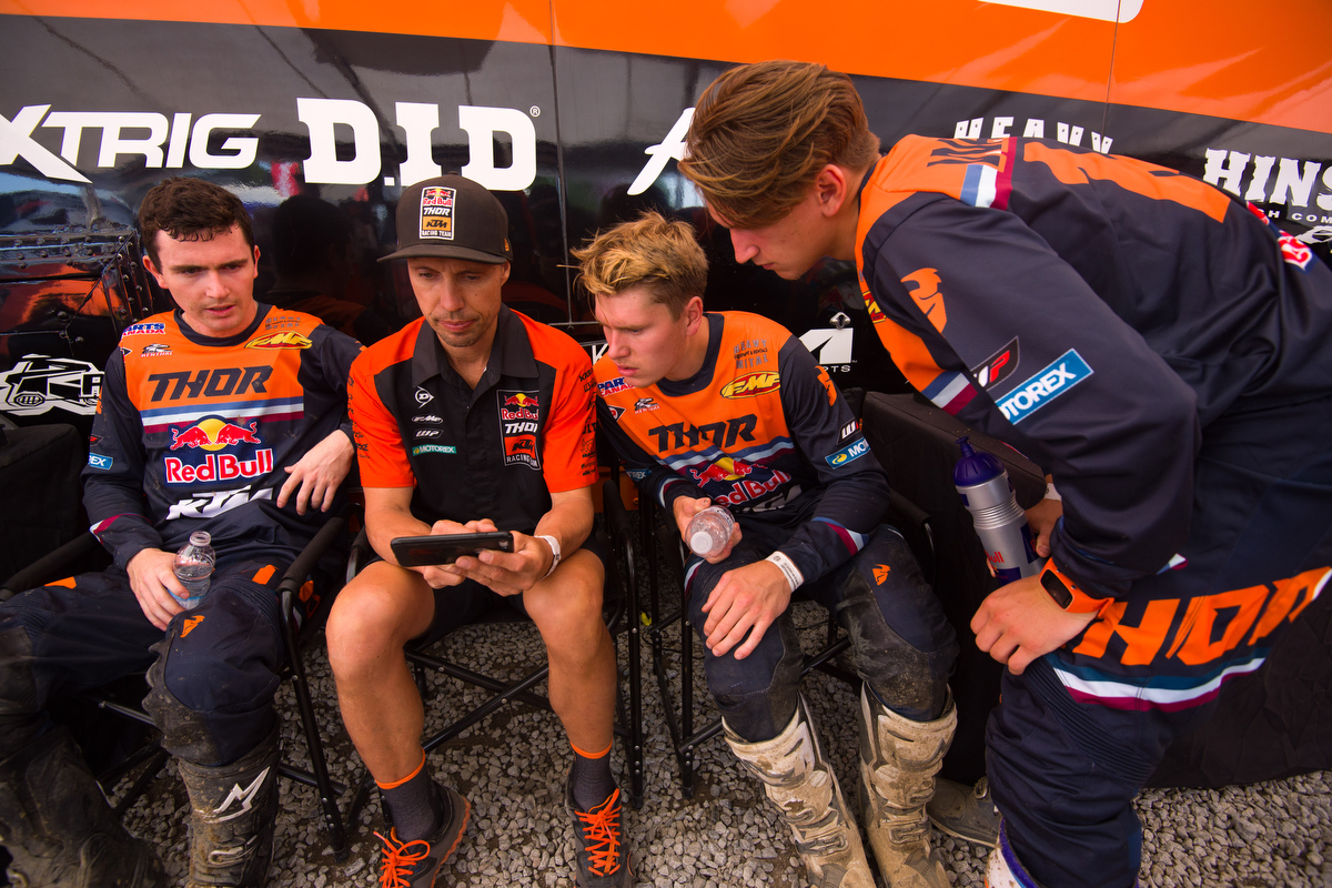 5-time Canadian Champ, Jean Sebastien Roy, goes over some race footage with his Red Bull KTM Thor Racing riders.
