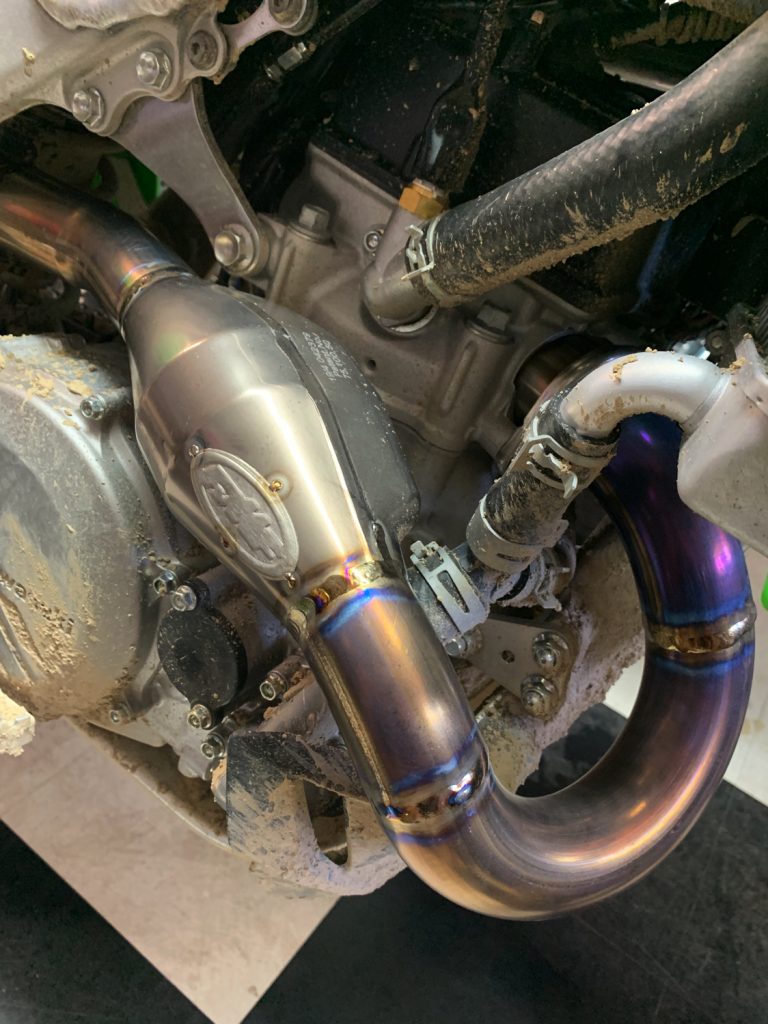 The stock power curve of the 2020 KX450 engine has a snappy throttle response from 0-10% throttle opening (with a free feel to it) and at times can almost be too touchy through corners with the standard green coupler installed. Once rolling on the throttle and passed the corner, the power is not quite as strong as the Honda or Yamaha, but still creates an easy to ride power feel on the track. I didn’t necessarily need more rpm response with the 2019 KX450, but I would be lying if I said I couldn’t use more bottom and mid range puling power when coming out of corners. If you go back and read my review of the MX Style FMF Megabomb headpipe with 4.1 muffler from 2019 (https://www.keeferinctesting.com/offroad-testing/2018/8/14/fmf-41-rct-titanium-muffler-system-2019-kawasaki-kx450) you will read that the MX Style Megabomb smoothed out the low end power delivery more than the stock muffler system did, but had more mid range meat, which was noticeable immediately. In a perfect world, I would love to get more of that newfound mid-range “meat” (that the MX Style and FMF 4.1muffler system brings) and shift some of it towards the bottom end. This is why my curiosity lead me to this FMF “SX Style” headpipe.