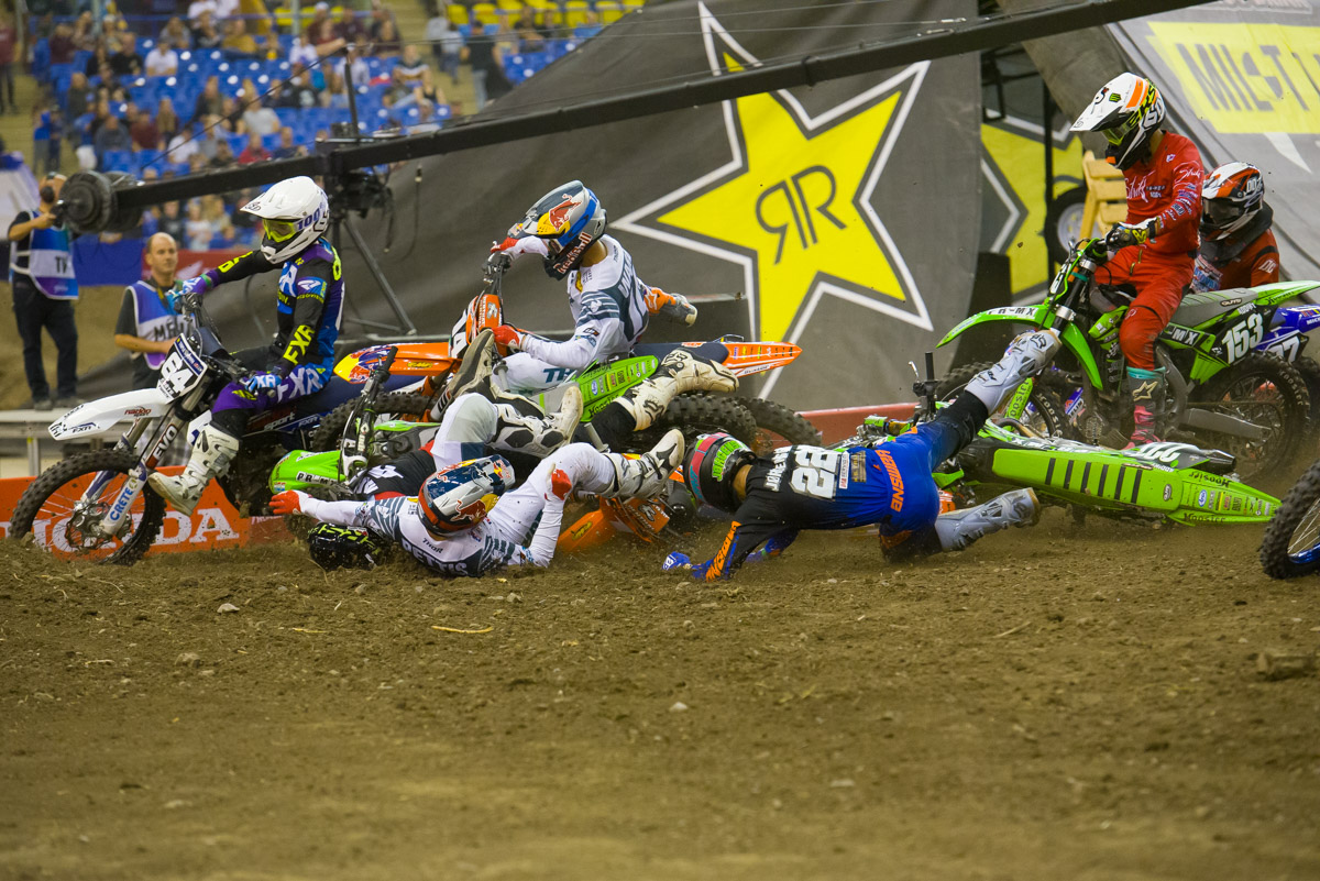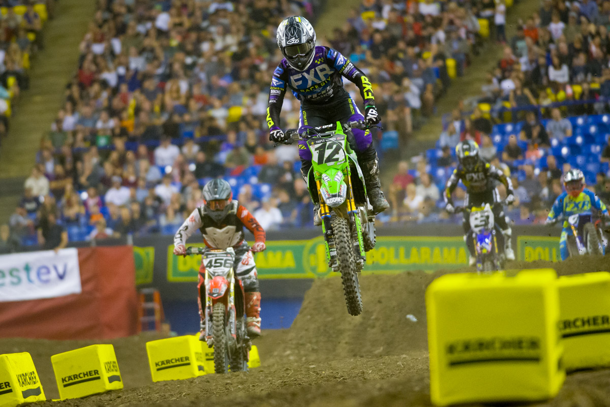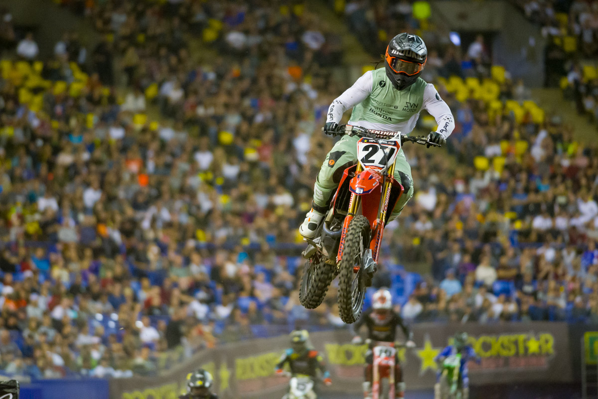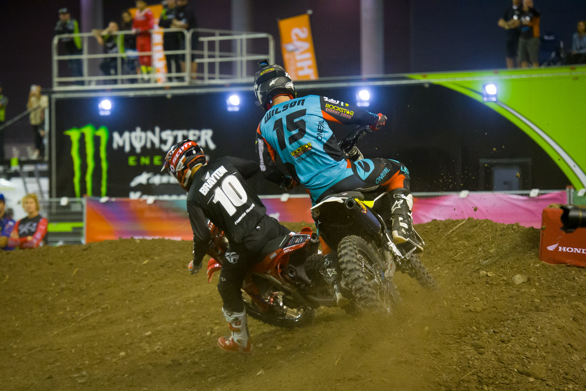 I was very surprised at Cole Thompson’s (#1) lack of speed. He’s a very good SX rider and I thought he’d be in the mix more than he was.Matt Goerke’s Montreal went about as well as the rest of his year has gone. Not sure what’s happening here but he’s just been off for most of the year.CADE IS NO GATE FILLER! With limited time on the new Kawasaki, I thought Clason did pretty well and it sounds like he has a home with them for 2020.Brayton’s starts weren’t there but he was in the class of both Stewart and Wilson but he just couldn’t set his own pace.Skip Norfolk is a fan of Jayce Pennington and just wants to see him stay upright and get some momentum.I love retro gear, everyone knows that but for some reason I can’t get into this Fox stuff that Dylan Wright is wearing. I dunno, it’s just me I guess. Anyways, Wright was very fortunate to win the overall with 5-2 scores and a crash in each main. When it’s your year, it’s your year…Lots of confusion over who got third in MX2 but it ended up being this guy, Jorgenson, who put two steady races in. Who am I kidding, almost no one in MX2 put two steady races together.Ah man, I think Jess Pettis really jacked his knee up in a first turn crash in main #2 after dominating main #1. I really hope it doesn’t wreck his 2020 SX series.Andy Wilson telling Andrew about countertops and cabinets.THE JSR got honored along with some other French Canadian heroes in the intermission and that’s always cool.So did Carl Vaillancourt who was actually on his original 91 CR125 with a Mugen cylinder and head.Mookie looked almost as good as ever. I did think he was better last year but hey, it’s his first race off a bad injury.The Brayton/Wilson main event #2 battle was perhaps the best one of the night. Both guys were swapping spots like crazy and having a blast doing it.My name is Steve Matthes and I’d like to apologize to Phil Nicoletti for making fun of him on social, on my shows, in texts to him for going on his booze cruise. He rode great…maybe he needs to go on more?Carnage in 250SX main event #2.Pettis looks crushed and it doesn’t look good for his knee.Renzland won main #2 in a wire to wire ride that showed his SX potential.250SX podium and Wright has clinched the 250 triple crown for the year.Dean O was the big winner at Montreal SX with 1-3-1 scores.450SX podium. Poor Phil…he tied for third but of course he gets fourth.