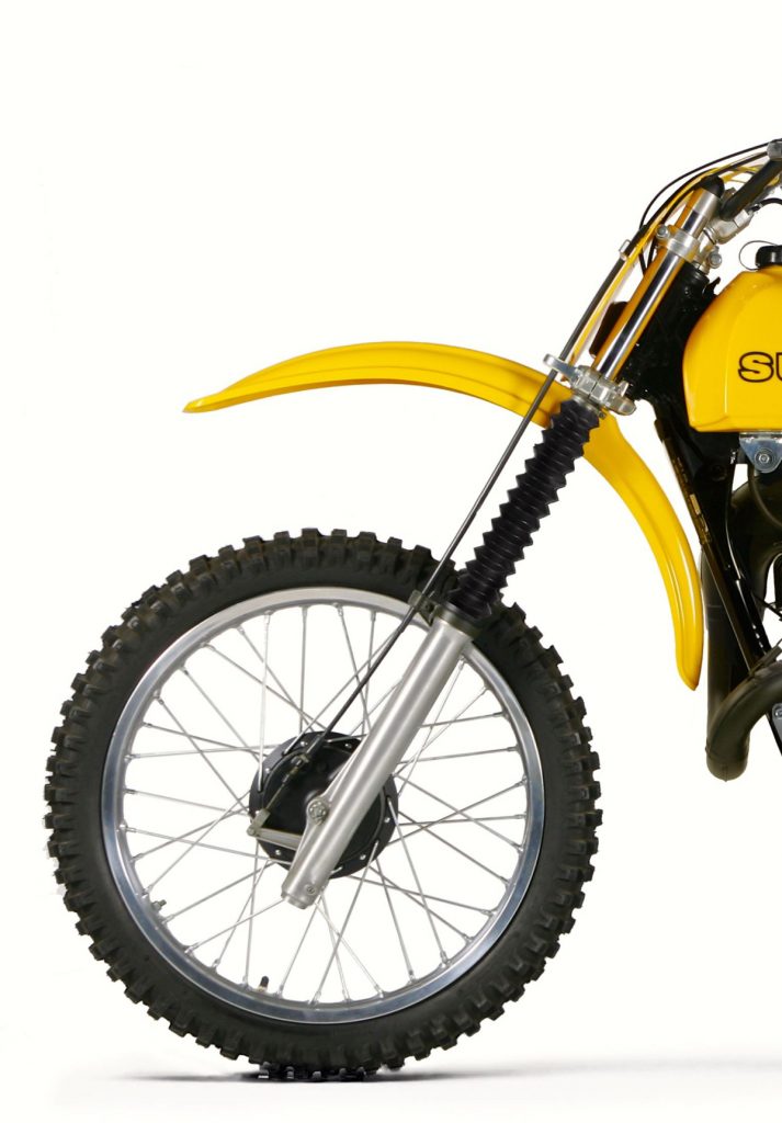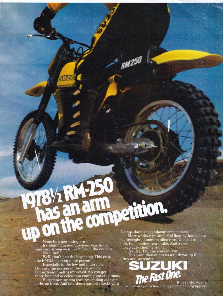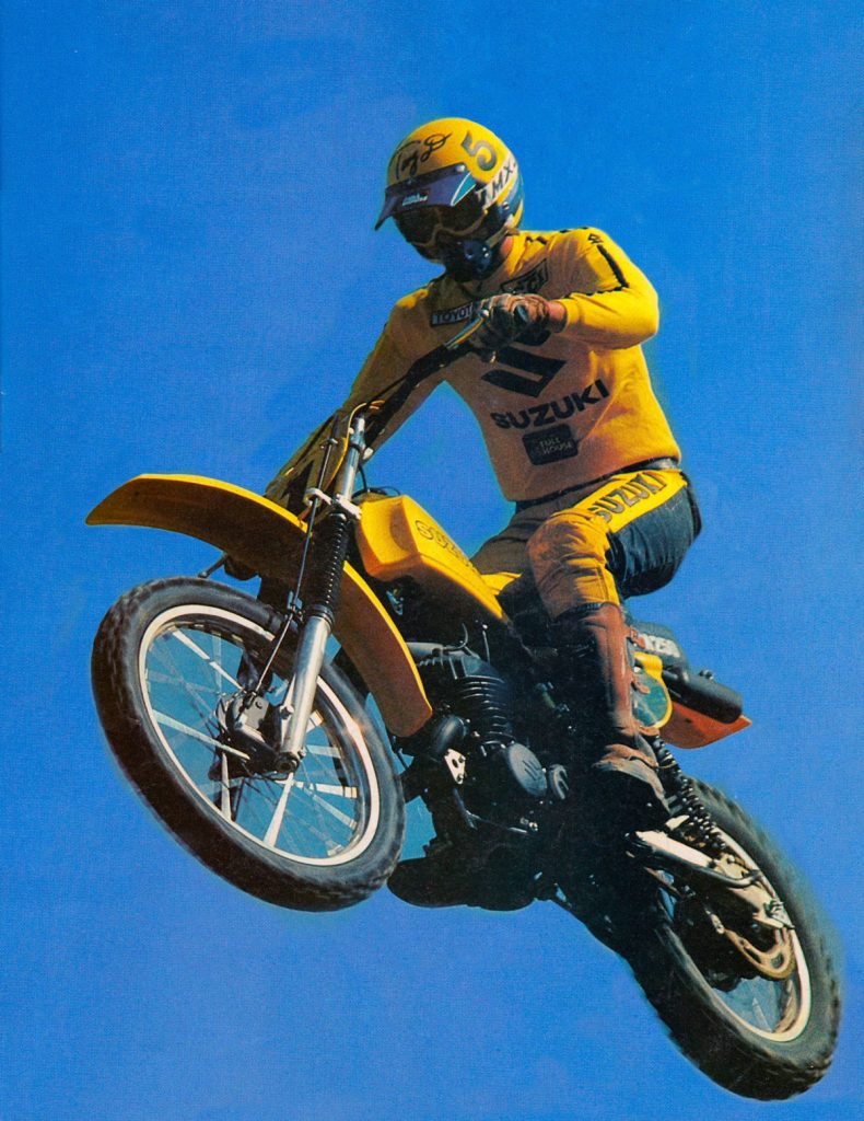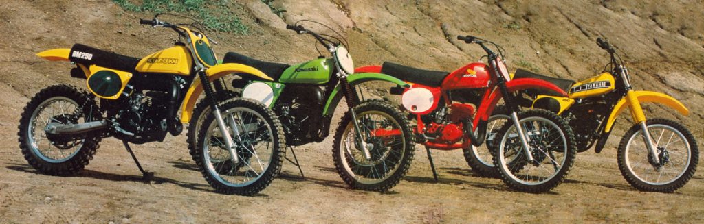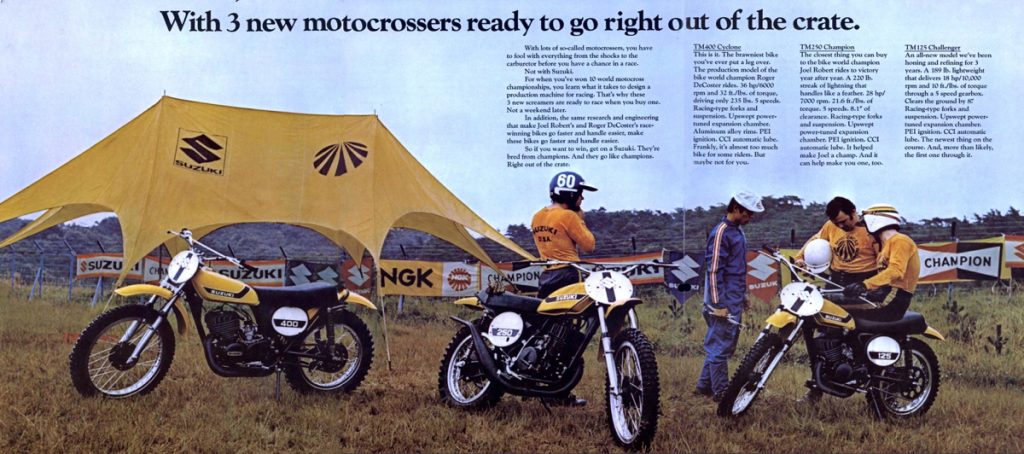 While early Suzuki ads proclaimed their motocross models to be “race ready right out of the crate,” the reality was quite different. It was not until 1976, with the introduction of the first RM250, that Suzuki could finally back up that boast in the 250 class. Photo Credit: Suzuki