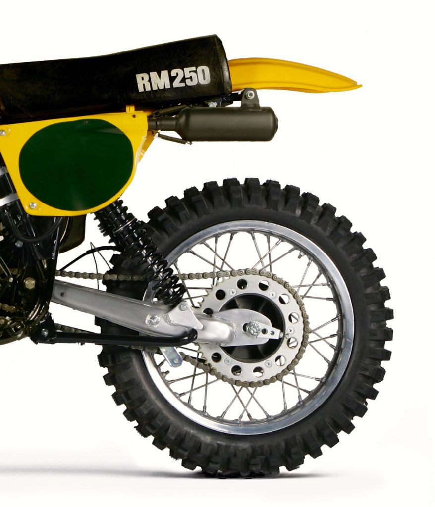 Dubbed the 1978 ½ RM250C-2, this new model maintained the basic motor and frame of the ’78 “C” model, but added new bodywork and majorly-updated suspension. The new bodywork featured revised fenders, an all-new tank and a shorter (19mm) seat for improved ergonomics. The new fenders featured a wider profile for increased mud protection and reinforcement ribs to reduce flex. The new tank incorporated revised styling and a change in material from aluminum to plastic.