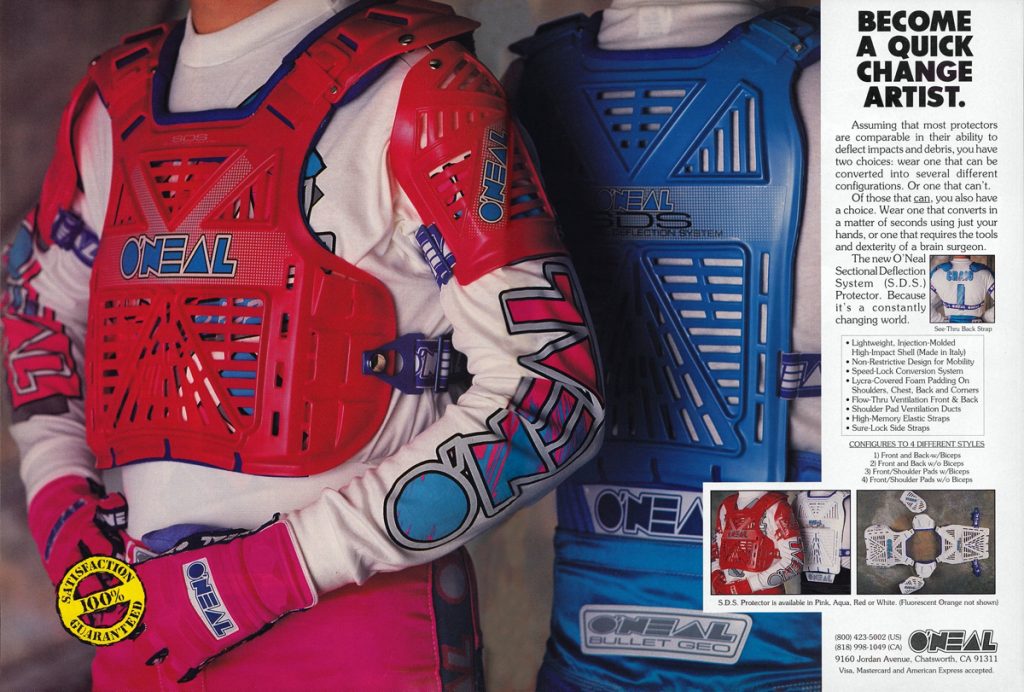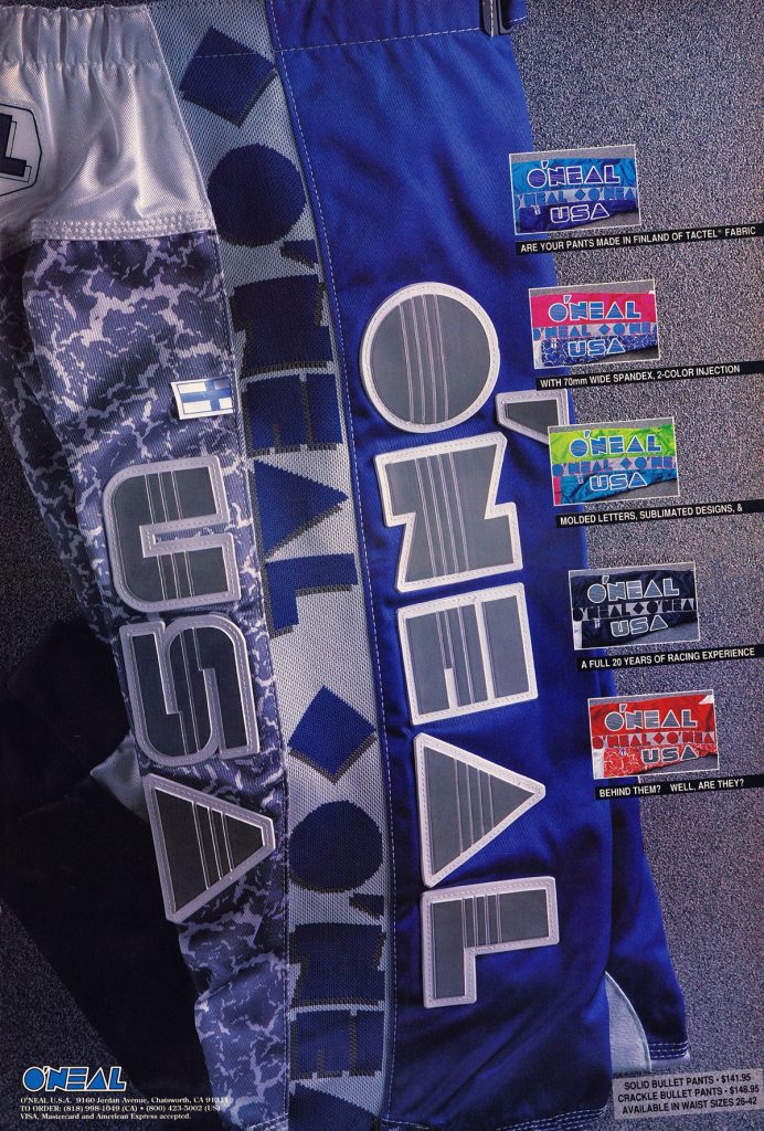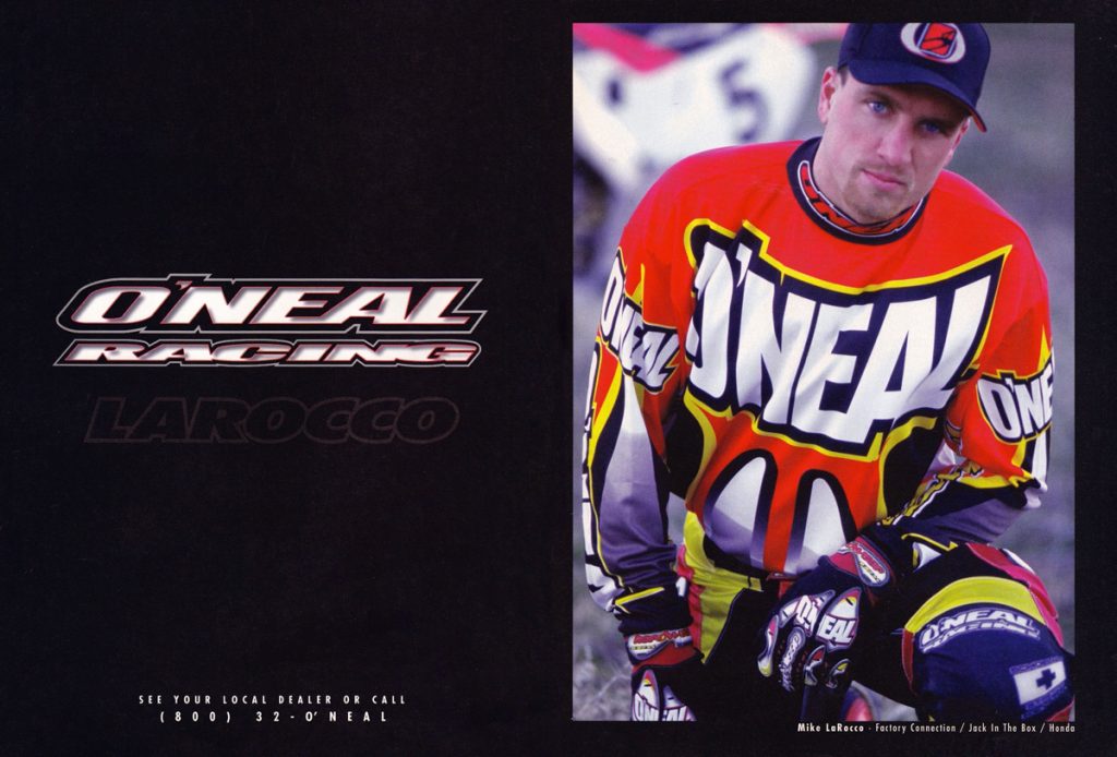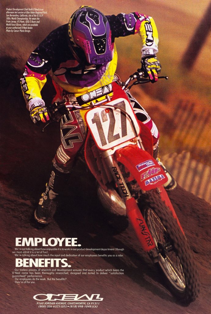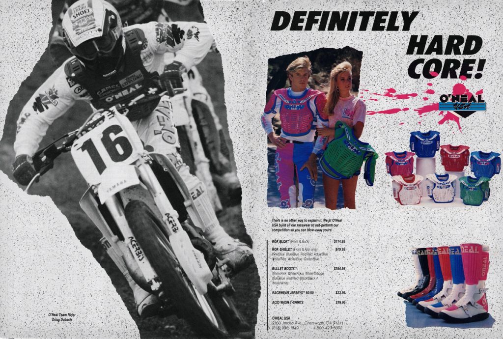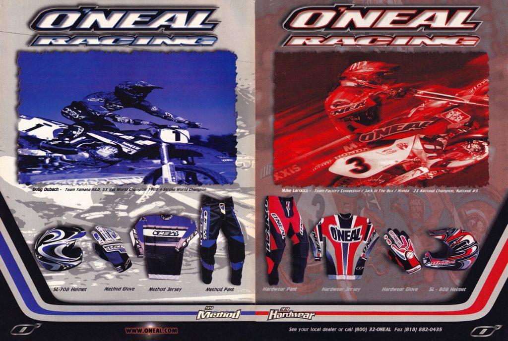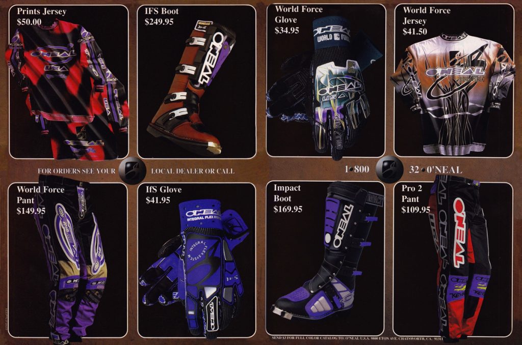 As we celebrate O’Neal’s fiftieth year in motocross, Matthes, Doug Dubach and I are back with another look at the gear that has made O’Neal a staple of tracks around the country over the last five decades. For this installment, I have combed through my thousands of magazines to find all of O’Neal’s classic motocross ads from the 1990s. Easily my favorite era for moto, the nineties were awash in colorful gear and even more colorful personalities.