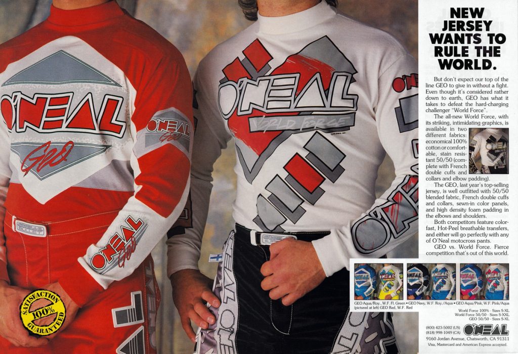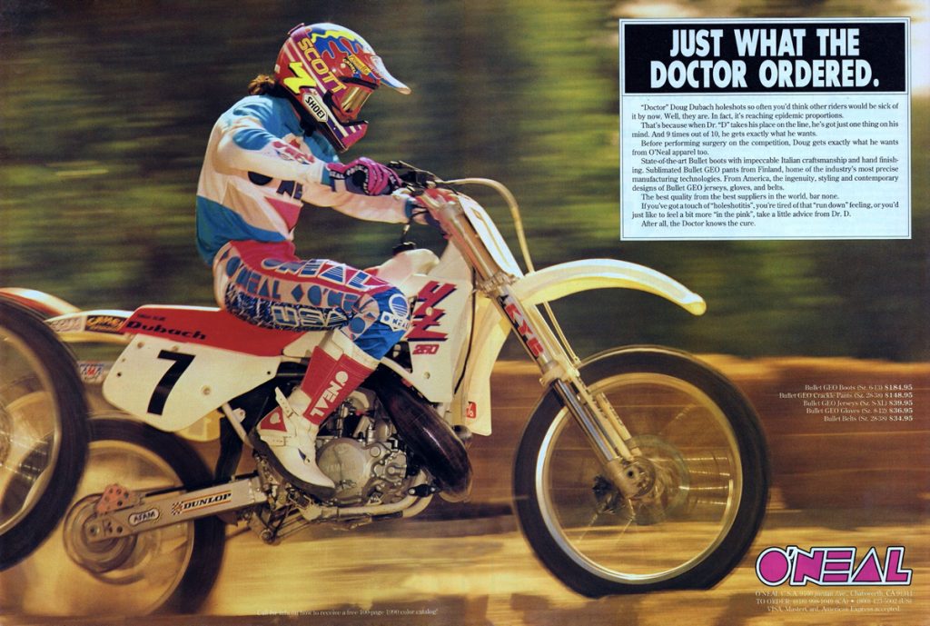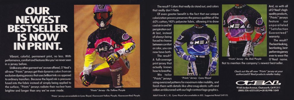 As in our previous entry that covered O’Neal’s origins, this one is going to look back at the brand through the ads that they produced. For this second O’Neal installment, we are going to go through O’Neal’s motocross gear ads from the nineties year-by-year. Along the way, I am going to be adding my thoughts to each, with Matthes and The Doctor chiming in where they feel necessary.
