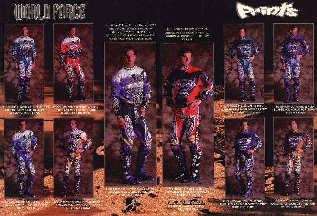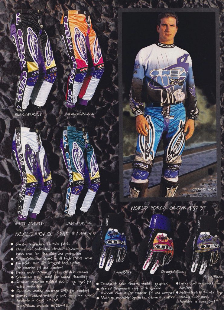 Blaze: LOVE, LOVE, LOVE the new World Force pants and jerseys for 1993. That pinstripe is a clear rip-off of AXO’s older 125ST pants but who cares? It looked great in 1991 and it still looks great here. If O’Neal updated the materials and re-introduced this design today these would sell out in a matter of hours. Stamp it!