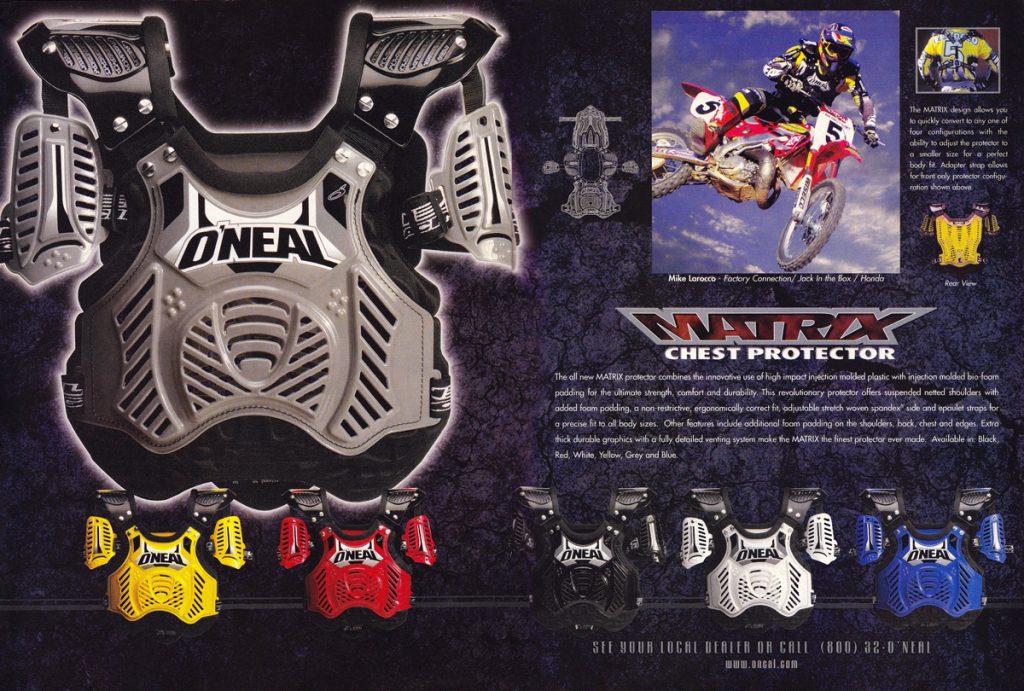Blaze: The new Matrix chest protector for 1998 finally brought features like the suspended shoulder pads that Fox and HRP had offered since the mid-eighties to O’Neal. As with most of their previous chest protector offerings, you wore this for the protection, not for the looks.