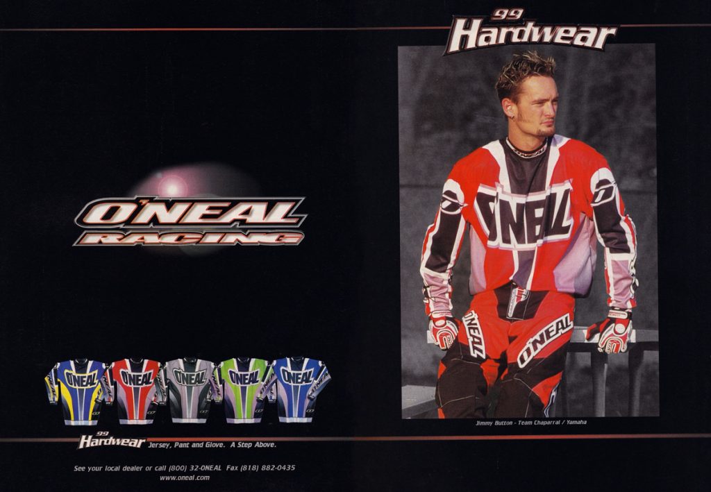 Blaze: In 1998, O’Neal started the tradition of having beautiful women in bikinis model their gear. Somehow, I think this was probably Jim Holley’s idea. Regardless of who thought of it, it guaranteed two things: 1) it would not ever appear in MXA, and 2) it would make it to the bedroom wall of every adolescent male with a RacerX or MX Racer subscription in North America. Call me crazy, but that is damn fine-looking gear.