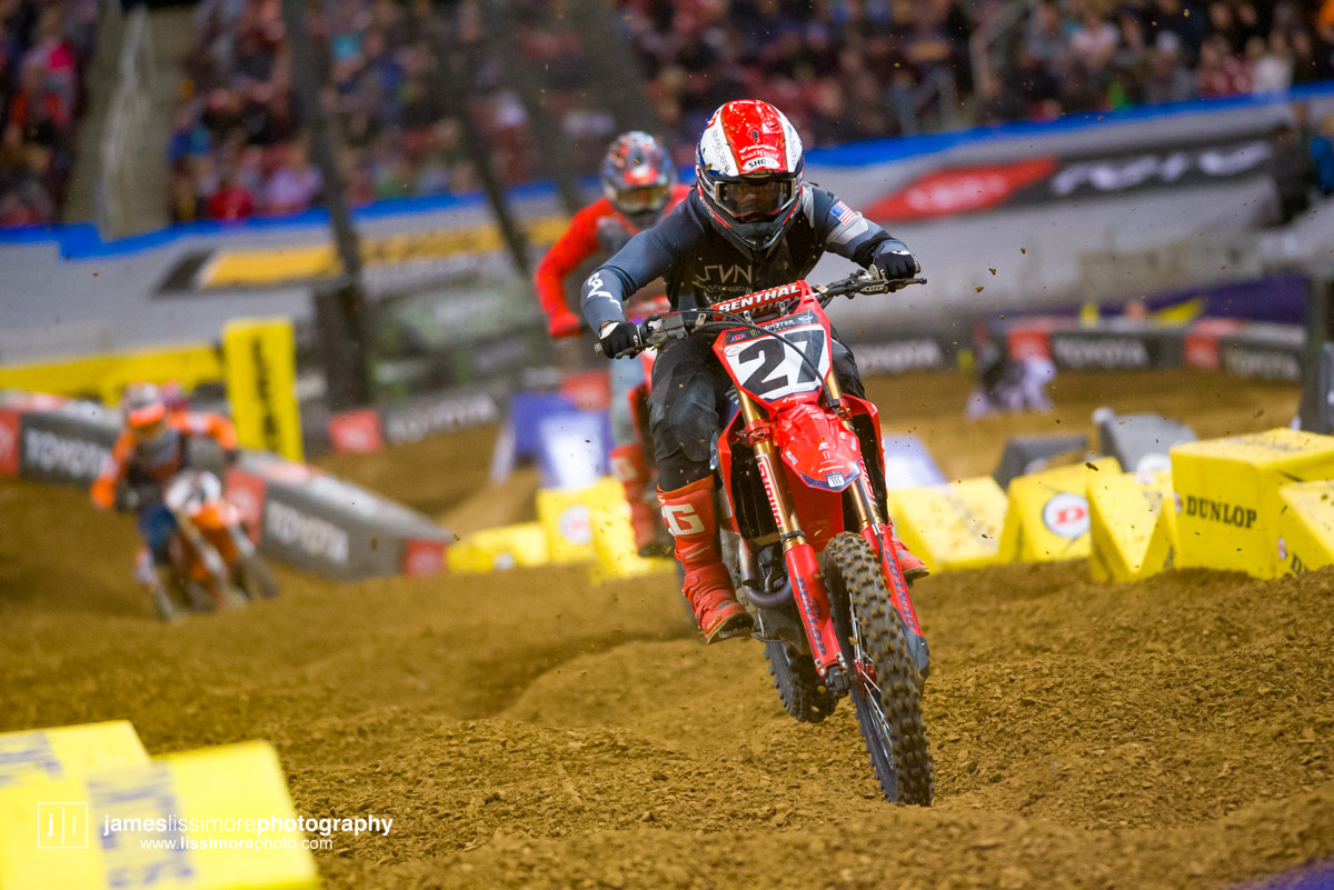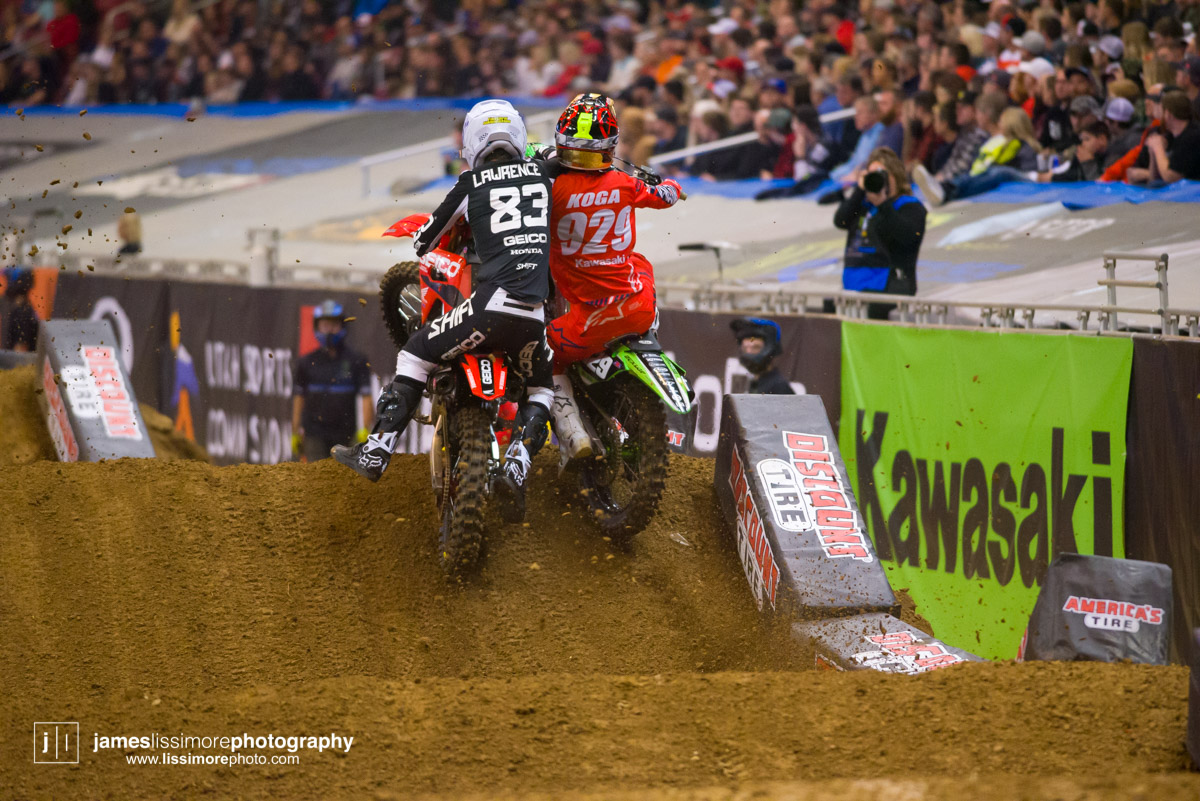 Deep sleeper Cade Clason sporting the new Jett Lawrence replica gloves.The fanny pack was back! All jokes aside, Hill has been pretty solid so far.Track talk is easily Steve’s favorite time of the day. Dan Truman’s stories never disappoint, either. Finally, Lars stole my haircut.This is a great example of how not to wear a hat.Shane Drew has worked with JB51 on many different teams and in many different situations. I am sure he is happy to see Barcia succeeding.Eli Tomac really stuck his neck out a few times on his charge to the front Saturday.Carlos Rivera is one of the nicest people you’ll ever meet. He also has more titles than most anyone you’ll ever meet.Poor McAdoo. He had a huge crash right in front of me and the bike landed on him just to make things as bad as possible. I don’t know the exact timetable on collapsed lungs but it can’t be good.The Tehran SX featured an array of SCUD missiles fired at their own people.Being able to share moments like that with your child has to be near the top of any list. Also, this is such a great FLY ad.Hey guys, wtf? The track map said we go backwards here.Australian and Japanese relations have broken down for the first time since 1945.Troll Train did what Troll Train does. He doesn’t have the pace to go with Forkner, Cooper, and Ferrandis but top five’s are legit.This is the first lap of the heat race. This start was critical for Blose and Reed as they would finish 9th and 10th, just like they are pictured here.Eli Tomac was much better this weekend. Eli is coming, folks.AC and Zacho went at it like it was 2017. I love the aggression but let’s stay healthy, ok boys?Justin Cooper has been better than I expected. Kudos.Jett Lawrence might be the most exciting 250 rider to watch. He crashes a lot, goes fast, and more or less wreaks havoc at all times.Hartranft is giving the TLD KTM team some much needed help. Way to deliver.The most talked about fantasy pick of the day, Aaron Tanti came through in the clutch, qualifying in the LCQ. I didn’t have the balls to pick him.Hometown win, Ferrandis lost a bunch of points, engaged to a Monster girl… life is good for Austin Forkner.I was unaware of said Missouri Mafia but I am into it. I am also curious as to why his pants are so dirty?Huskies for days at the front of the main event. Nice work by Roczen here to get up front quickly.“Don’t even think about that inside line, JB.”Favor repaid. Adam got into Zacho pretty good in the prior turn and I think Zach was done with the punching bag routine.I have been thoroughly impressed by Barcia so far. Dude is not messing around.Slingshot engaged. Mookie is so damn good in the whoops.This turn was weird. It was just before the finish and a flat left. It formed 2-3 ruts all night but they were incredibly close to each other. That also caused some aerial drama with riders almost colliding on the tabletop after.I am over here and second place is still over there.Trey has been testing a lot for HRC Honda and it looks like it’s paying off.It’s a celebration, bitches! Congrats to Roczen and everyone in his corner for finally making it back to the top step.