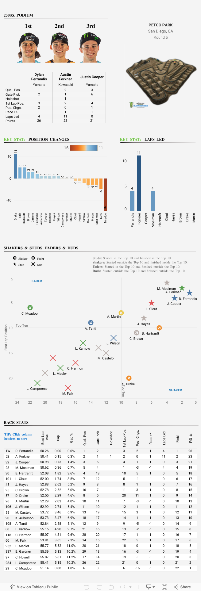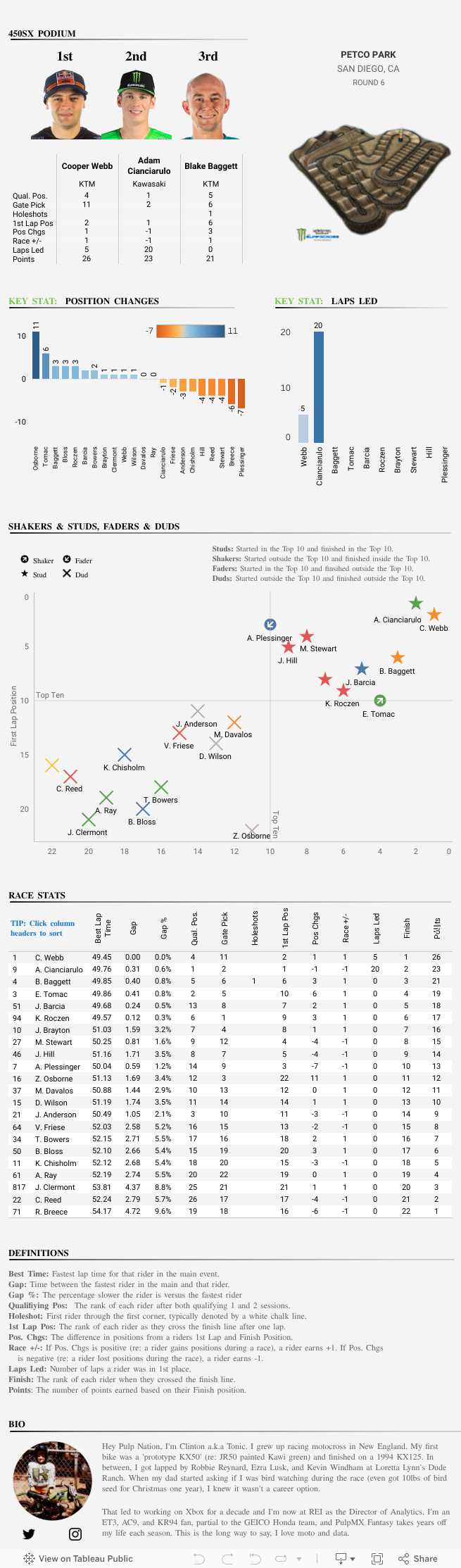 A lot will be said and written about Cooper Webb’s ride, but it’s Blake Baggett’s holeshot and podium finish that deserve Stat of the Race. Baggett has shown the speed in qualifying and heat races, but simply hasn’t had a standout main event in 2020. That changed in San Diego. Can he build on this momentum and get a win in 2020!?