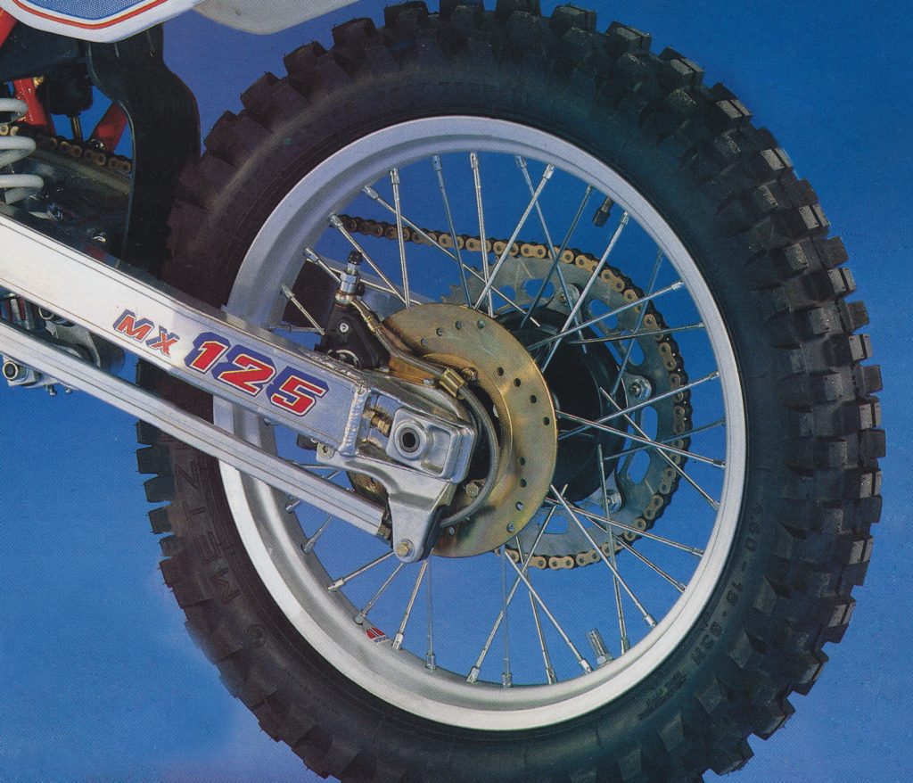 Braking performance on the rear of the KTM was superior to the drum of the outdated Yamaha YZ250, but not up to stuff with the powerful units found on the KX and CR in 1987. Photo Credit: Motocross Action