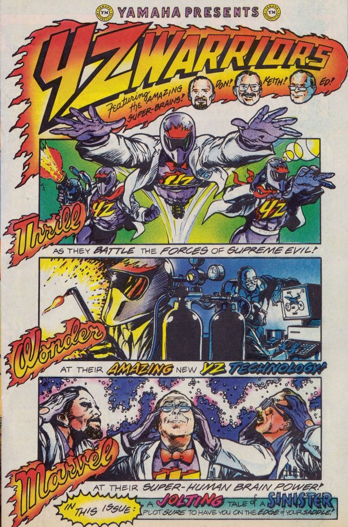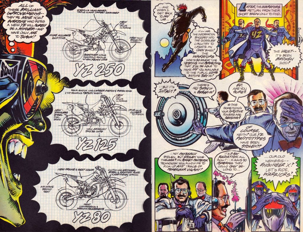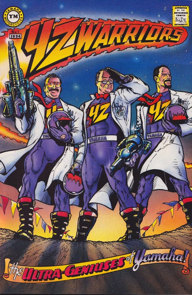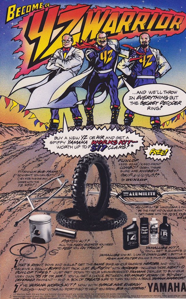 In order to sell this kaleidoscope of nineties awesome, Yamaha chose to use, wait for it…a comic book. Yes, a comic book. That bastion of pre-pubescent teens everywhere. Even more bizarrely, the ad team chose to leave out all of Yamaha’s star riders and instead focus on a trio of team personnel as the stars of the ad. While this might seem a bit odd in hindsight, there were probably good reasons for the decision. In 1994, Yamaha had built its ads around Damon Bradshaw and Jeff Emig, only to have Damon retire at the end of the ’93 season (remember, the ads are shot months well in advance). During the ’94 season, the team had an equally high-profile parting with Damon’s replacement, Mike Craig. With Emig’s contract up at the end of the ’95 season, perhaps the team thought it might be safer to rely on long-time employees like Keith McCarty, Ed Scheidler, and Don Dudek to be the faces of the ad. After all, the three Yamaha stalwarts had also appeared in the ’93 and ’94 version as well alongside their star riders.